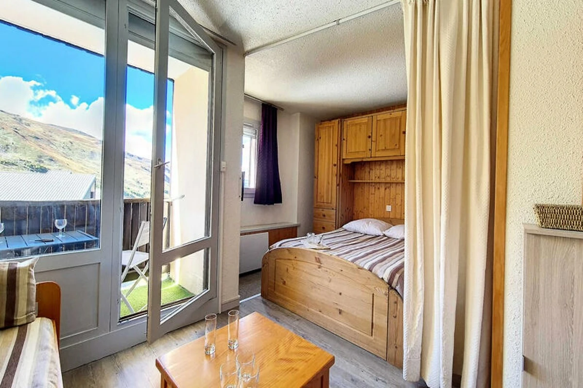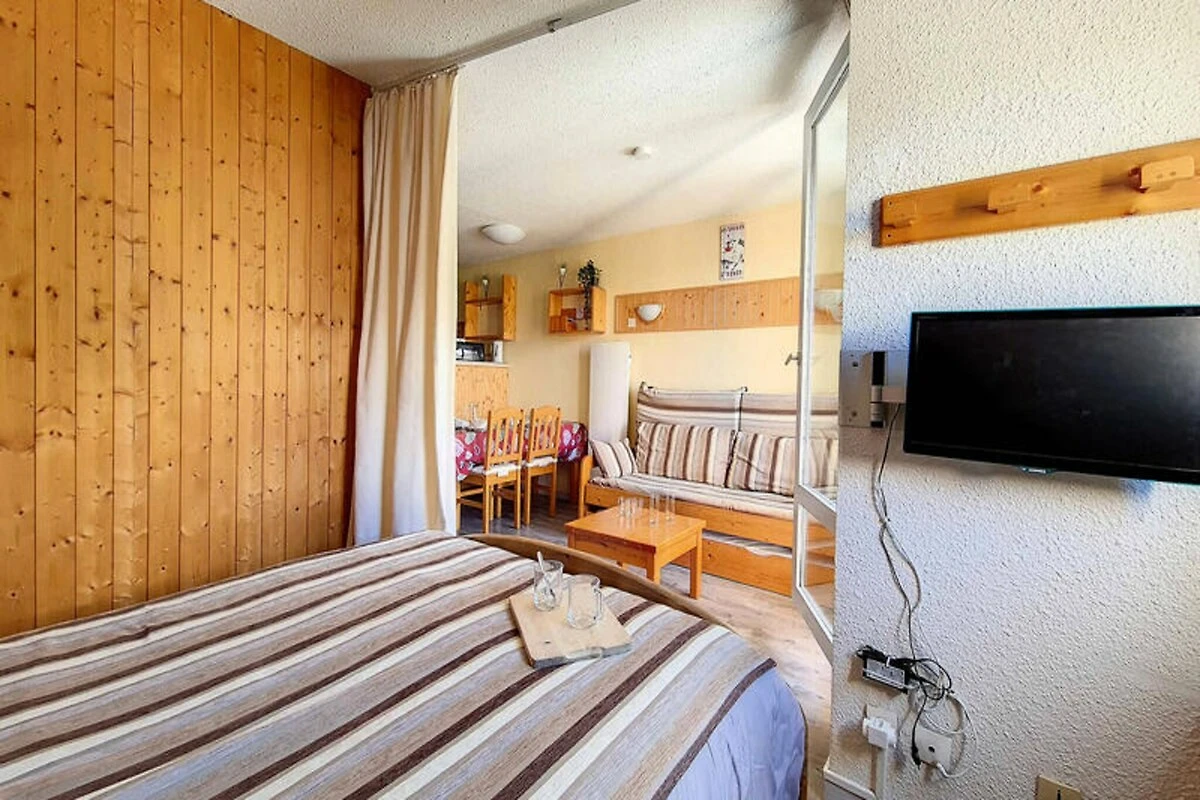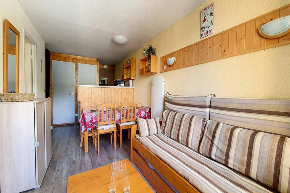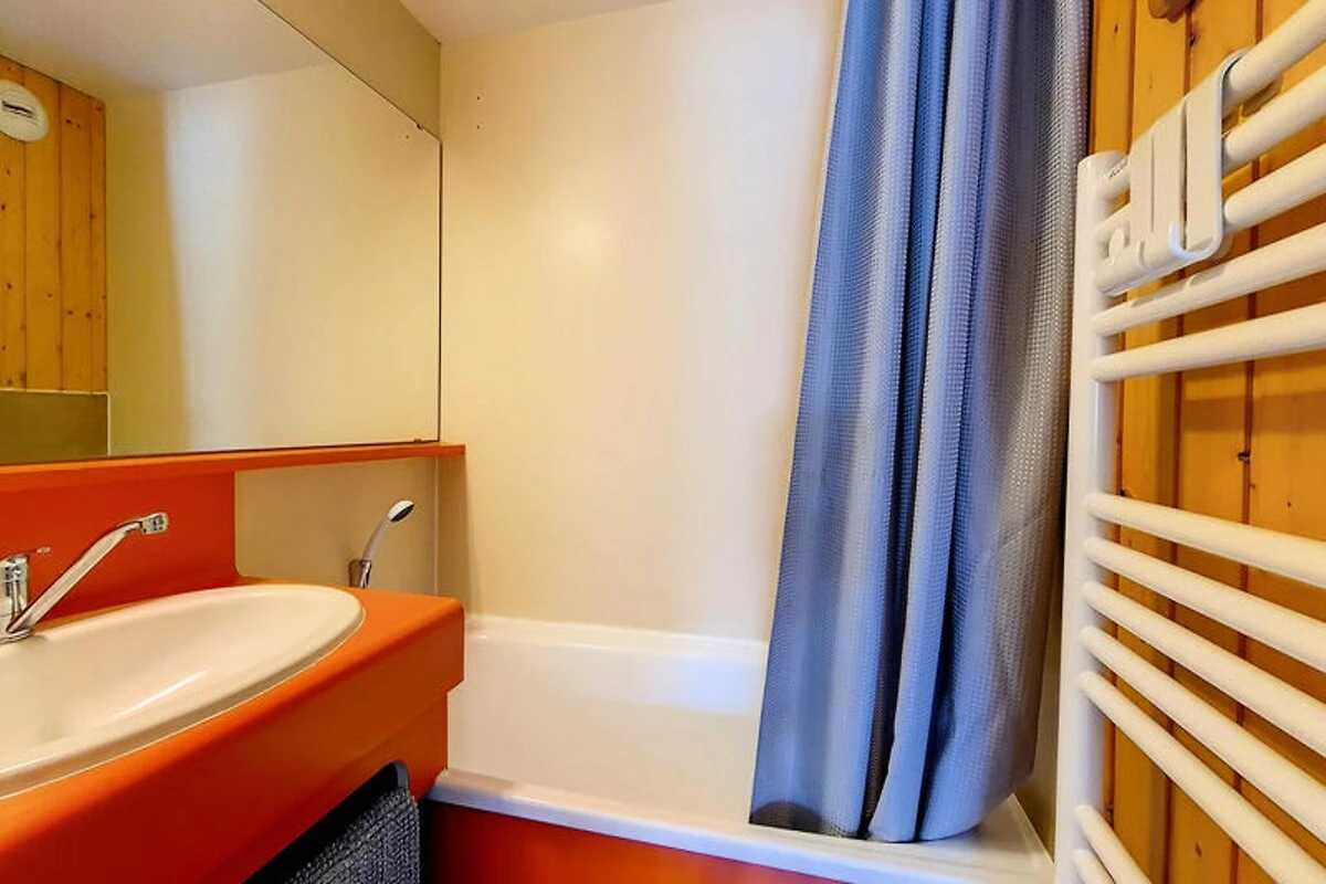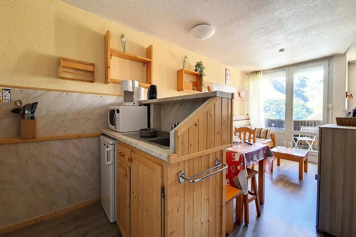 Questo appartamento di 28 m², situato al 4° piano con ascensore, è progettato con cura per ospitare fino a quattro persone. Il soggiorno dispone di un letto singolo e di un letto estraibile, mentre una zona notte separata con tenda offre un comodo letto matrimoniale. Un'ulteriore zona notte include un letto a castello, ideale per famiglie o piccoli gruppi. La cucina completamente attrezzata vanta comfort moderni come un mini-forno, un microonde, una lavastoviglie e una macchina per il caffè, per permettervi di preparare pasti abbondanti dopo una giornata di sci o di esplorazione. Un balcone esposto a sud/est vi invita a godervi il sole mattutino e ad ammirare il paesaggio alpino circostante.