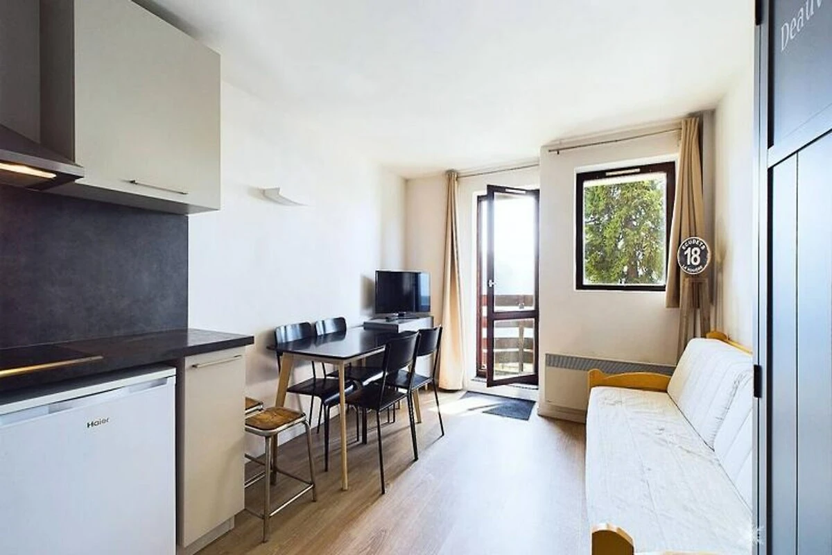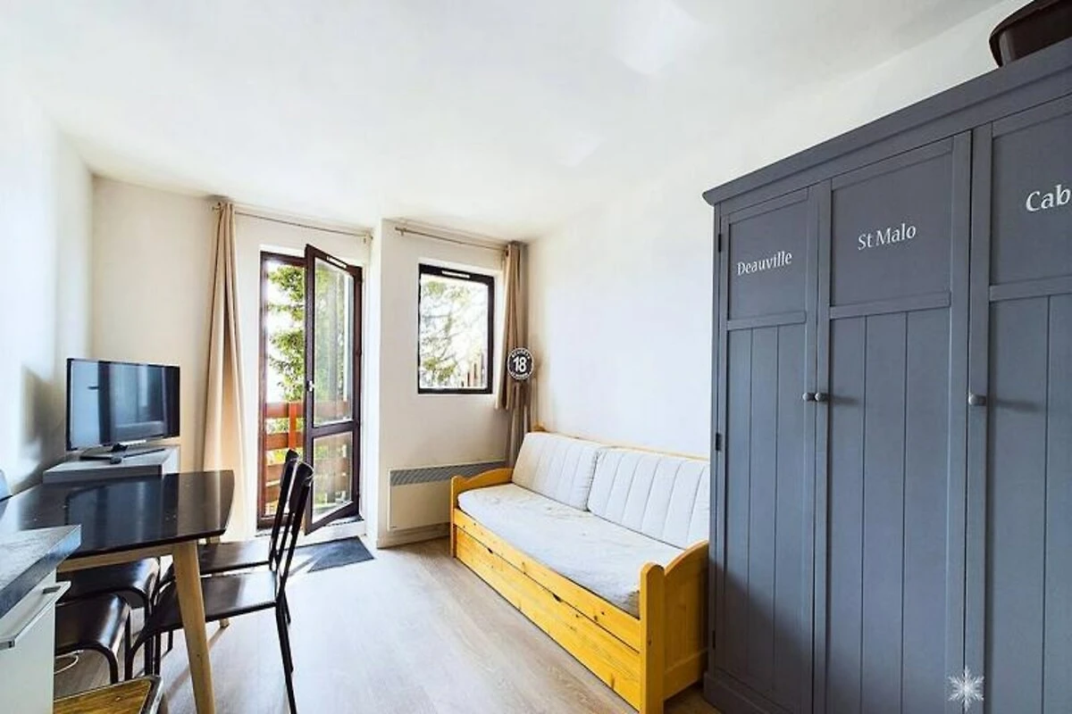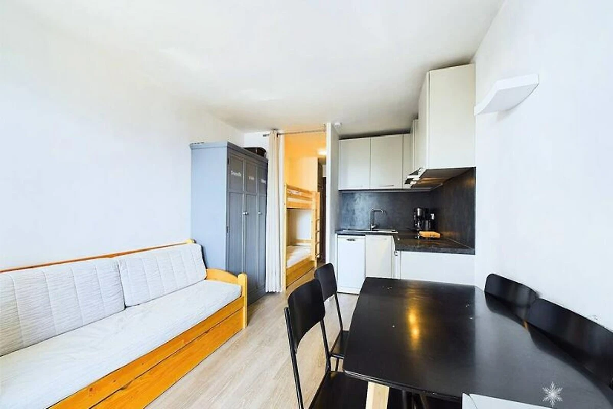 Recentemente ristrutturato e classificato 2 stelle, questo luminoso monolocale di 22 m² può ospitare comodamente fino a quattro persone. La disposizione intelligente prevede un ingresso con due letti a castello, separato dalla zona giorno da una tenda per una maggiore privacy. Il soggiorno vanta un divano con letti estraibili, una TV e l'accesso a un balcone esposto a sud che inonda lo spazio di luce naturale e offre una splendida vista sulle montagne. L'angolo cottura è dotato di piano cottura in vetroceramica, frigorifero, forno e microonde, rendendo facile preparare i pasti dopo una giornata sulle piste. Un moderno bagno con doccia e servizi igienici separati completano i comfort, garantendo un soggiorno confortevole. È disponibile anche un armadietto per gli sci per la vostra comodità.