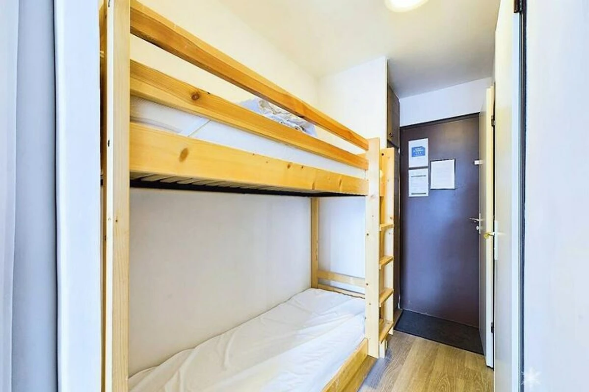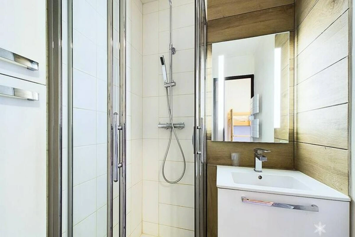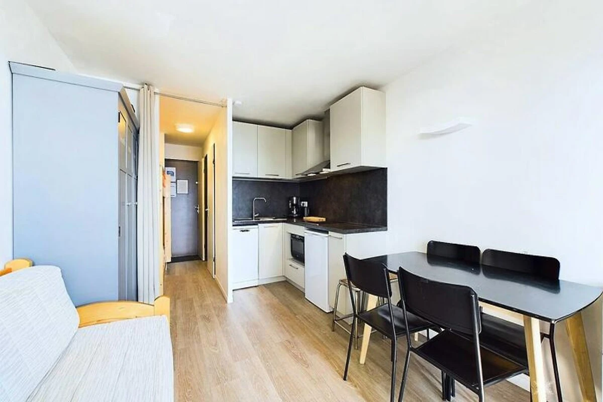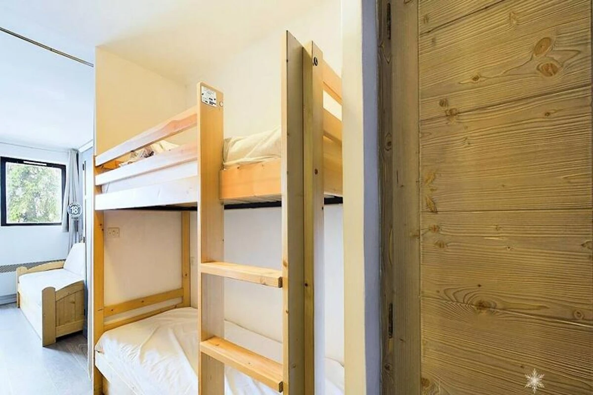 Recentemente ristrutturato e classificato 2 stelle, questo luminoso monolocale di 22 m² può ospitare comodamente fino a quattro persone. La disposizione intelligente prevede un ingresso con due letti a castello, separato dalla zona giorno da una tenda per una maggiore privacy. Il soggiorno vanta un divano con letti estraibili, una TV e l'accesso a un balcone esposto a sud che inonda lo spazio di luce naturale e offre una splendida vista sulle montagne. L'angolo cottura è dotato di piano cottura in vetroceramica, frigorifero, forno e microonde, rendendo facile preparare i pasti dopo una giornata sulle piste. Un moderno bagno con doccia e servizi igienici separati completano i comfort, garantendo un soggiorno confortevole. È disponibile anche un armadietto per gli sci per la vostra comodità.