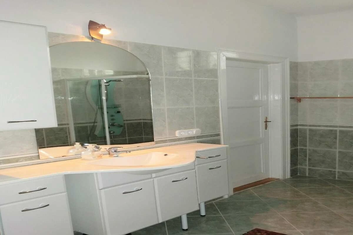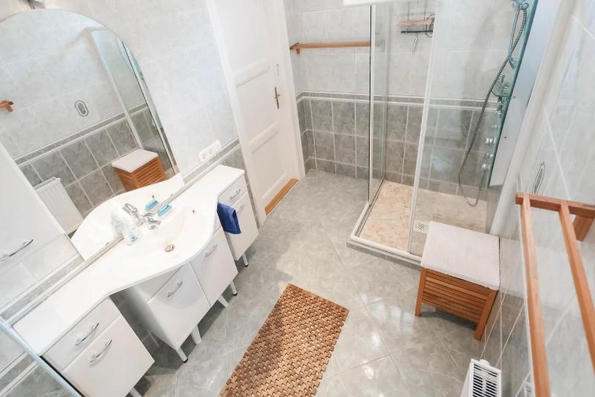 Il bagno è dotato di lavabo, mobile lavabo con specchio, asciugacapelli e una doccia extra-large (100 x 100 cm) con ingresso quasi a livello, getti idromassaggio e sistema di ventilazione.