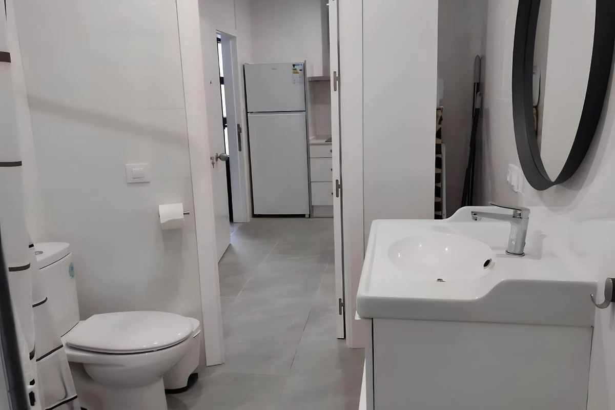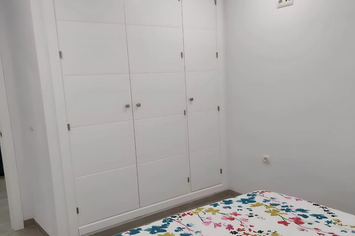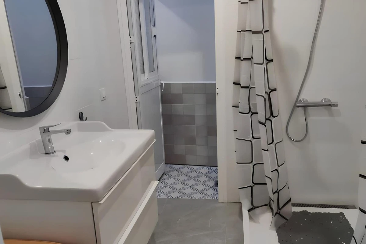 L'appartamento dispone di due camere da letto: una con un letto da 150 cm e l'altra con un letto da 135 cm, entrambe dotate di armadi e ampi specchi. Un bagno completo con doccia si apre su un piccolo patio dove troverete una lavatrice per una maggiore comodità.