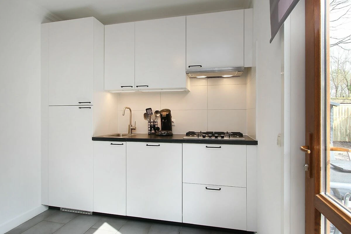 All’interno si trova un accogliente soggiorno con grandi finestre che offrono una vista diretta sul verde. Qui puoi rilassarti dopo una passeggiata, giocare o goderti insieme la tranquillità dell’ambiente. La cucina è semplice ma praticamente arredata e offre tutto om een maaltijd te bereiden. Aan de eettafel kun je samen ontbijten of de dag gezellig afsluiten.