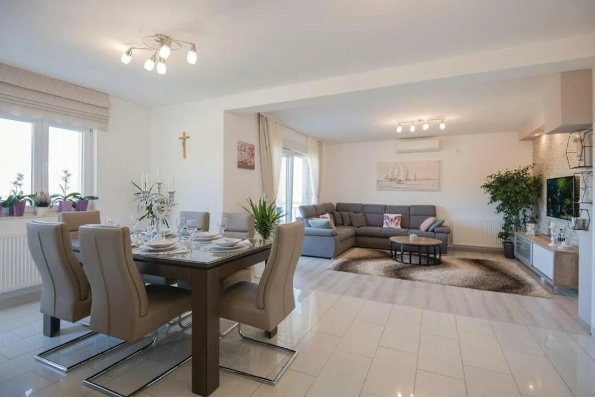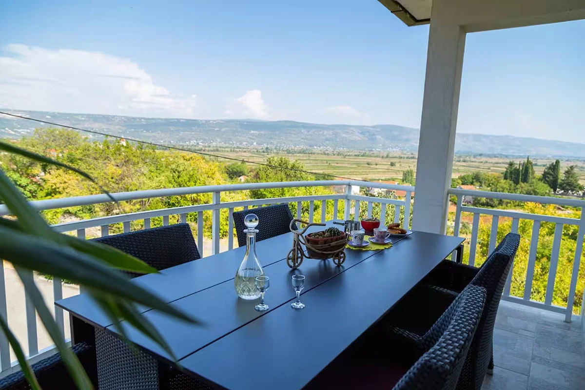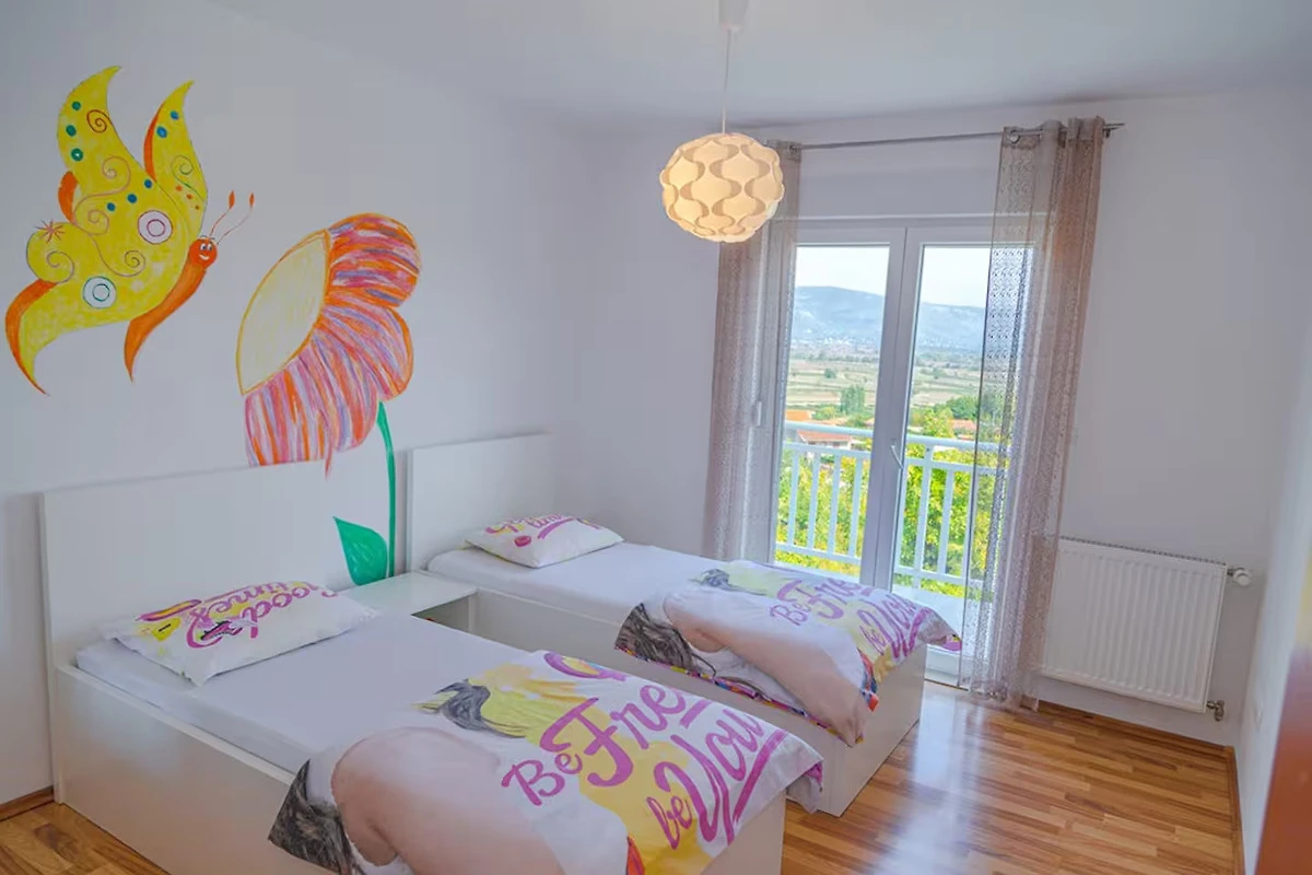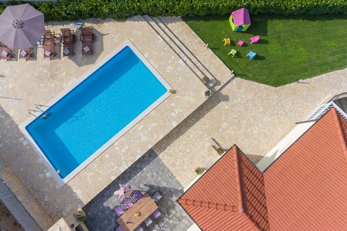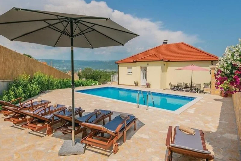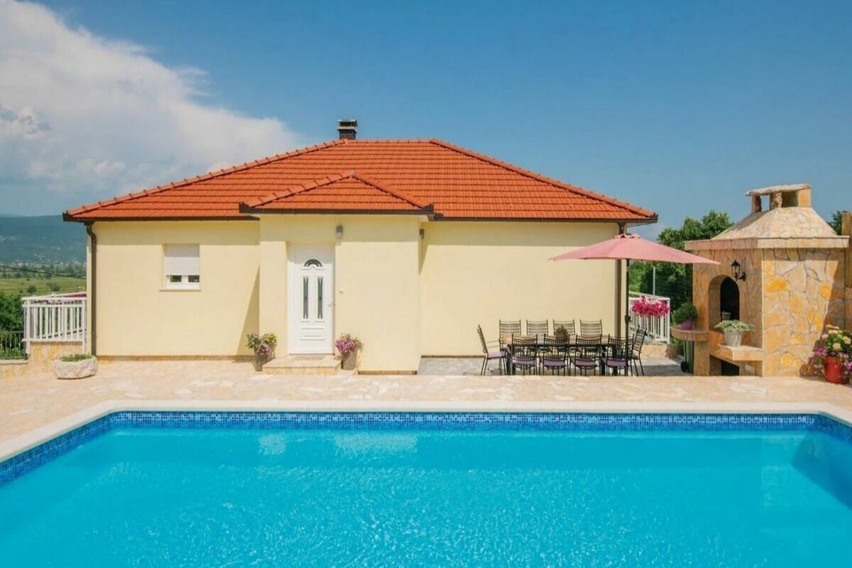 Bella Villa Katarina con piscina privata, terrazza, barbecue e parco giochi per bambini è ideale per famiglie che desiderano trascorrere una vacanza rilassante nella natura e nella tranquillità. Si trova nel pittoresco paese di Zmijavci, vicino alla città di Imotski, in un quartiere molto tranquillo e sicuro. Offre una splendida vista panoramica sulla città di Imotski, sui laghi di Imotski e su tutta la piana di Imotski. Questa casa vacanze indipendente, che può ospitare comodamente fino a 10 persone, offre un’oasi di tranquillità in una pittoresca valle di Imotski. La casa si estende sul piano terra e il primo piano. Dispone di 5 camere da letto, 3 bagni, un soggiorno con Smart-TV (Netflix possibile), una cucina e un ulteriore WC. L’intera casa è completamente climatizzata e dispone in totale di 6 climatizzatori. L’area esterna di questa struttura è un vero punto di forza e offre agli ospiti un paradiso privato e appartato nel giardino. Qui si trova la piscina (32 m²) con lettini per rinfrescarsi nelle calde giornate estive, oltre a una bella zona pranzo coperta accanto al camino-barbecue. I più giovani possono divertirsi nel campo sportivo erboso con due porte da calcio o giocando a ping-pong. La terrazza e il balcone offrono luoghi perfetti per godersi l'ambiente idilliaco o cenare all'aperto.