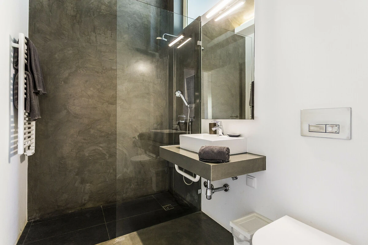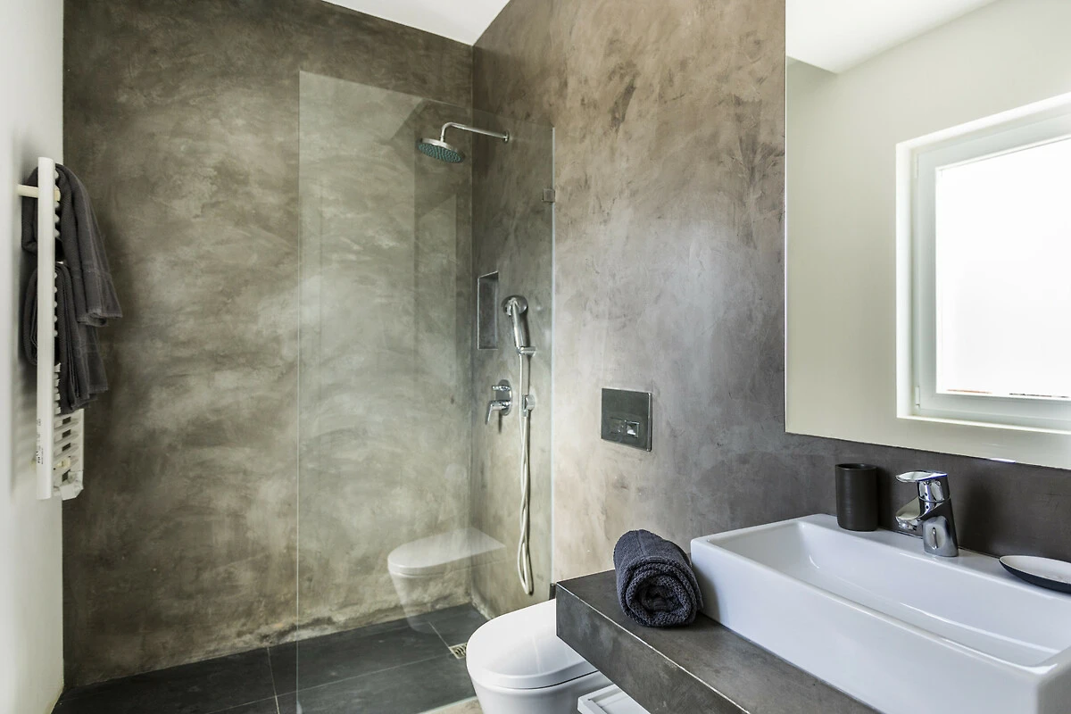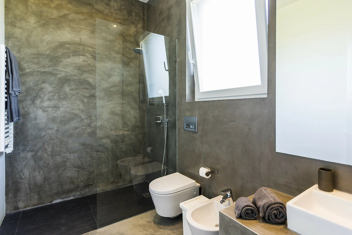 Each bedroom has its own private bathroom, which are done up in modern marble. The indoor dining area has space for everyone to be seated, and boasts a huge window that overlooks the swimming pool, which is just the other side of the wall. The main indoor living area is a massive open plan space with tonnes of sofa space and a flat-screen TV, with huge sliding doors that lead onto the terrace and feed light into the house all day long.