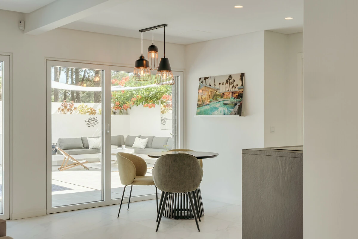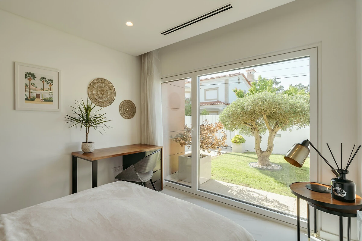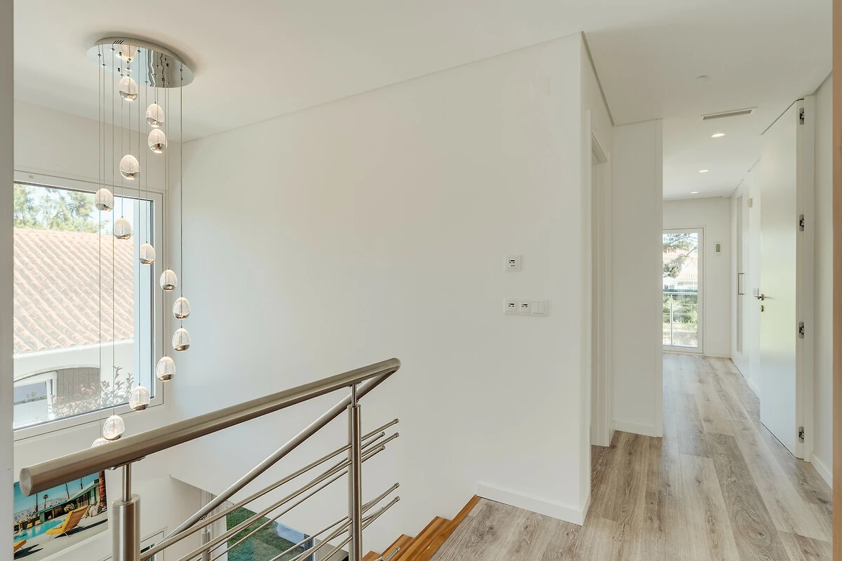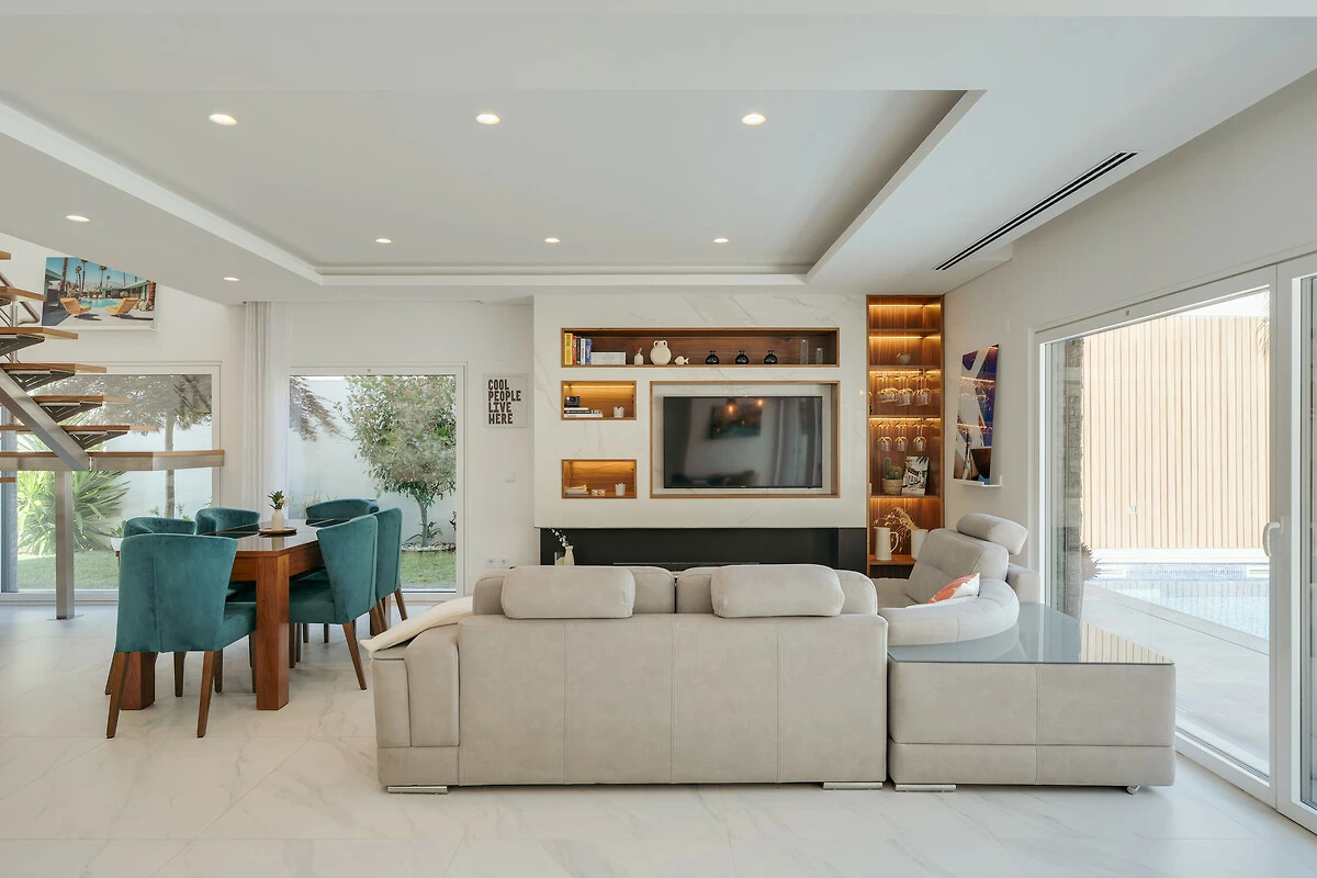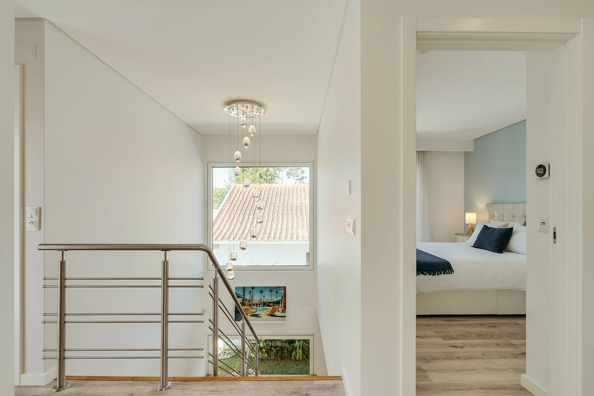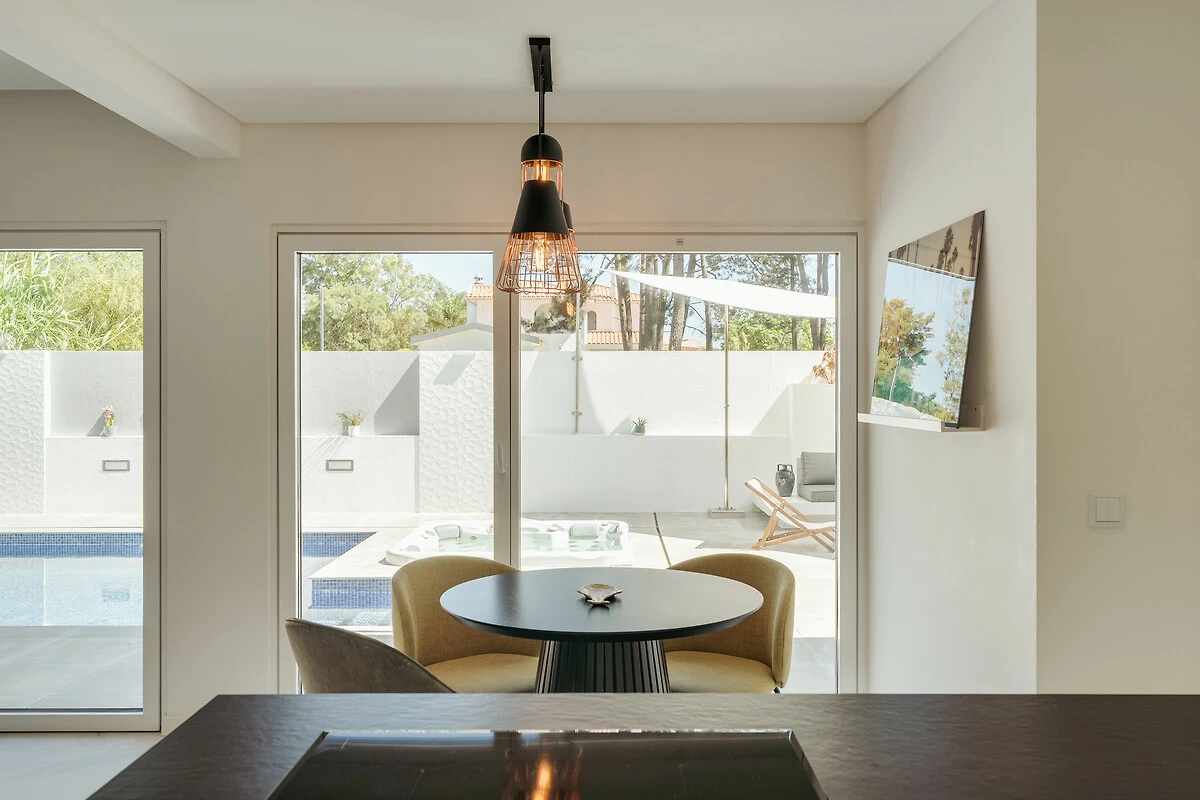 All'interno, la villa è progettata per offrire spazio, funzionalità e un'atmosfera accogliente. Il piano terra presenta un layout luminoso e aperto, con un'ampia zona living e sala da pranzo collegata in modo fluido a una cucina moderna in stile americano. Grandi porte a vetri permettono l'ingresso della luce naturale e offrono un facile accesso al giardino e all'area della piscina. Un home office, che può essere convertito in camera da letto con un letto retrattile, offre ulteriore flessibilità per gli ospiti. Questo livello include inoltre una lavanderia, un bagno completo e l'accesso interno al garage. Al primo piano, tre camere da letto doppie, tra cui una suite padronale con vasca idromassaggio. Le altre due camere condividono un bagno completo con doccia walk-in, e una delle stanze ha accesso a un ampio balcone con lettini, offrendo uno spazio tranquillo per rilassarsi.