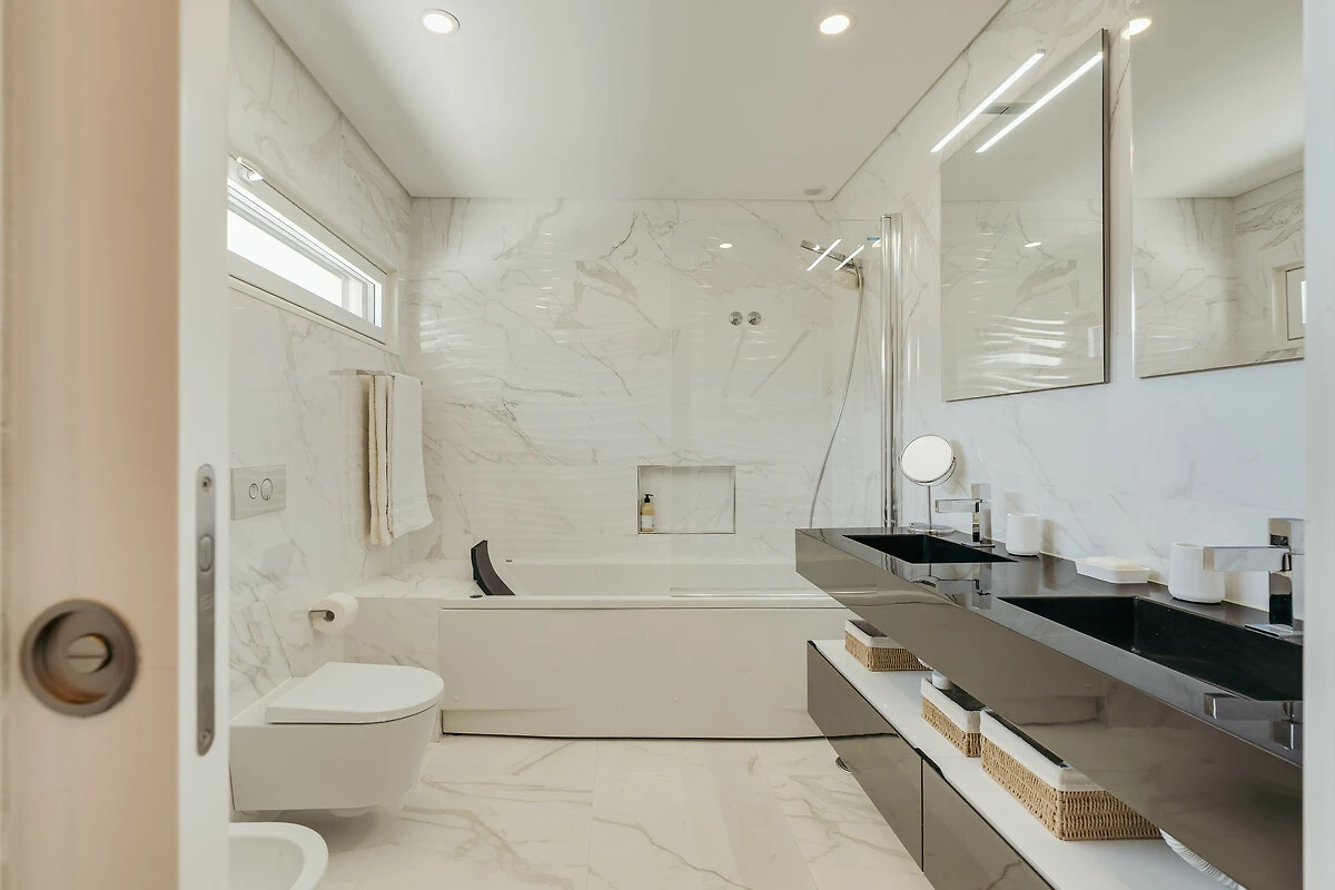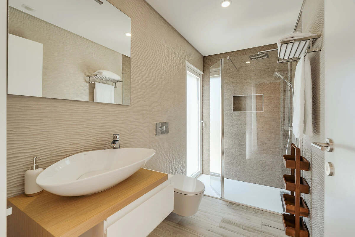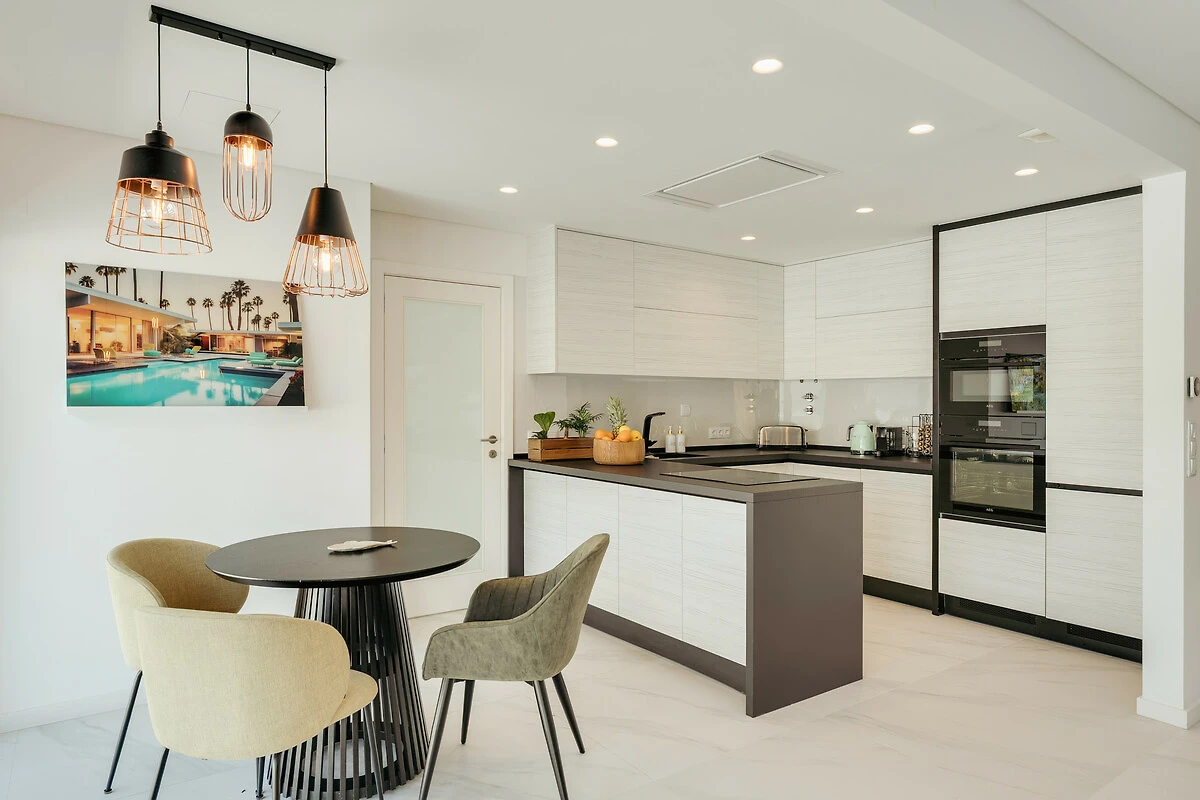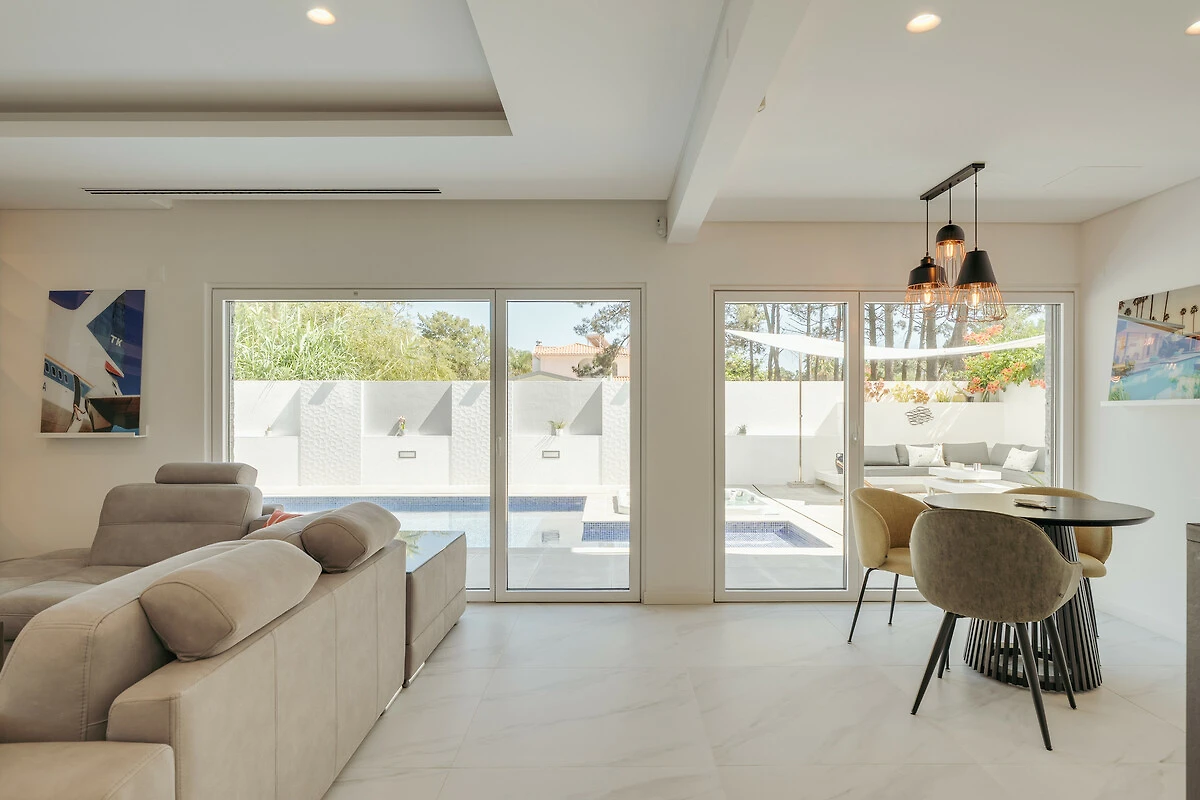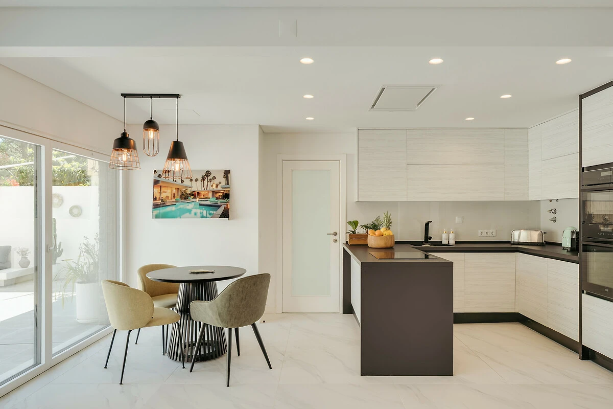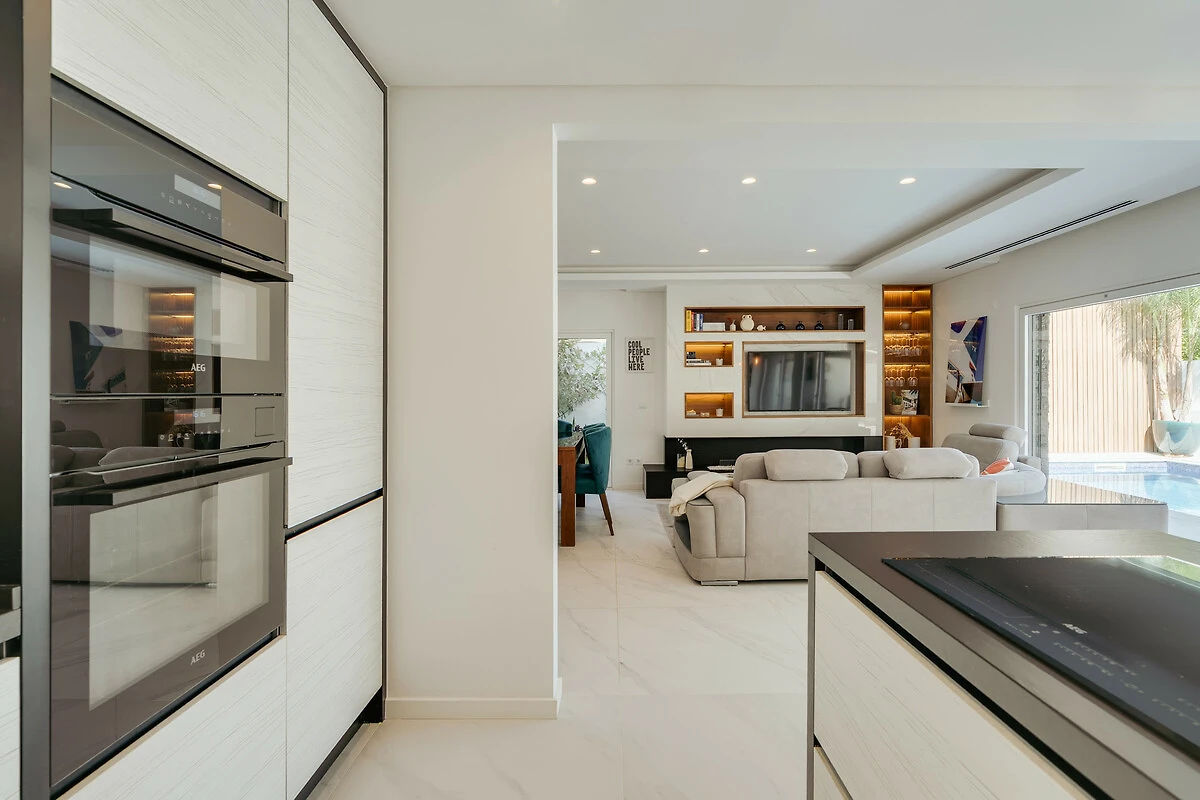 All'interno, la villa è progettata per offrire spazio, funzionalità e un'atmosfera accogliente. Il piano terra presenta un layout luminoso e aperto, con un'ampia zona living e sala da pranzo collegata in modo fluido a una cucina moderna in stile americano. Grandi porte a vetri permettono l'ingresso della luce naturale e offrono un facile accesso al giardino e all'area della piscina. Un home office, che può essere convertito in camera da letto con un letto retrattile, offre ulteriore flessibilità per gli ospiti. Questo livello include inoltre una lavanderia, un bagno completo e l'accesso interno al garage. Al primo piano, tre camere da letto doppie, tra cui una suite padronale con vasca idromassaggio. Le altre due camere condividono un bagno completo con doccia walk-in, e una delle stanze ha accesso a un ampio balcone con lettini, offrendo uno spazio tranquillo per rilassarsi.