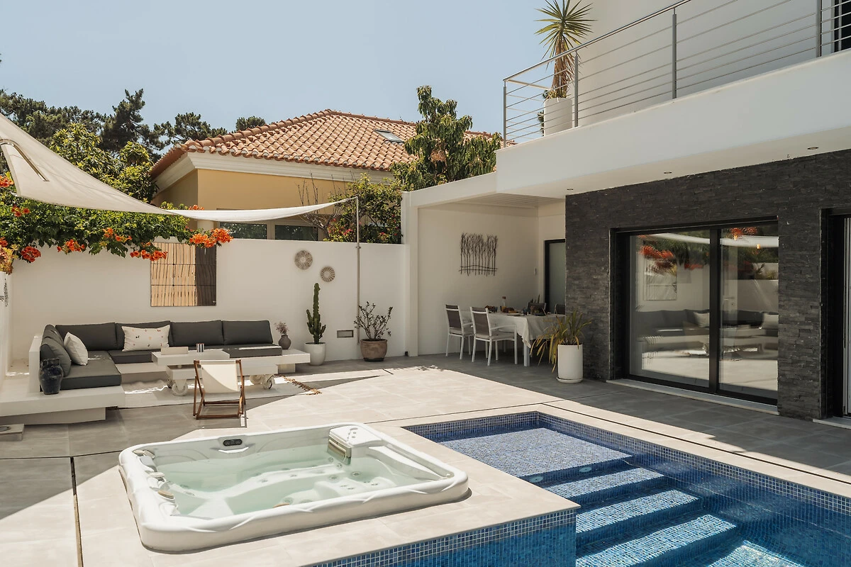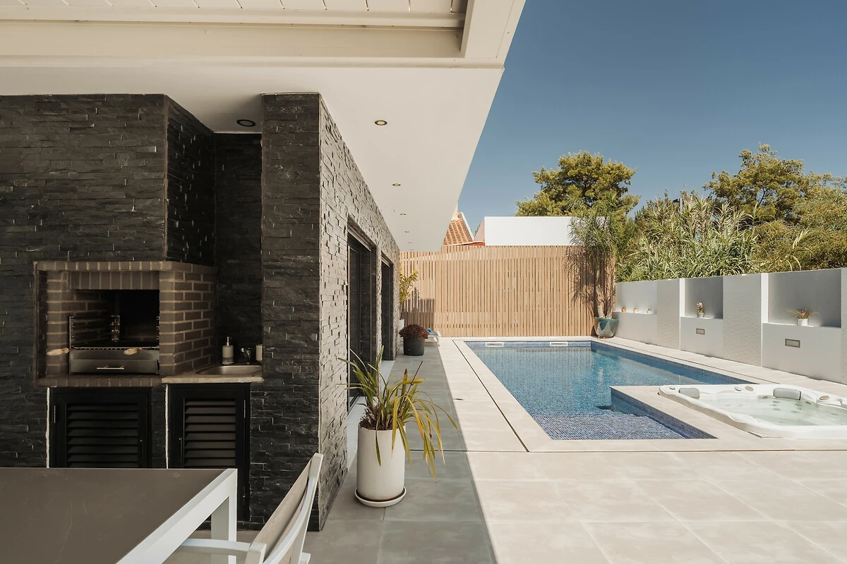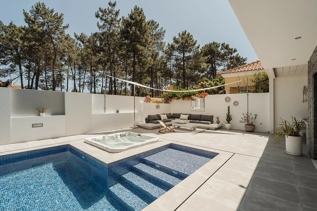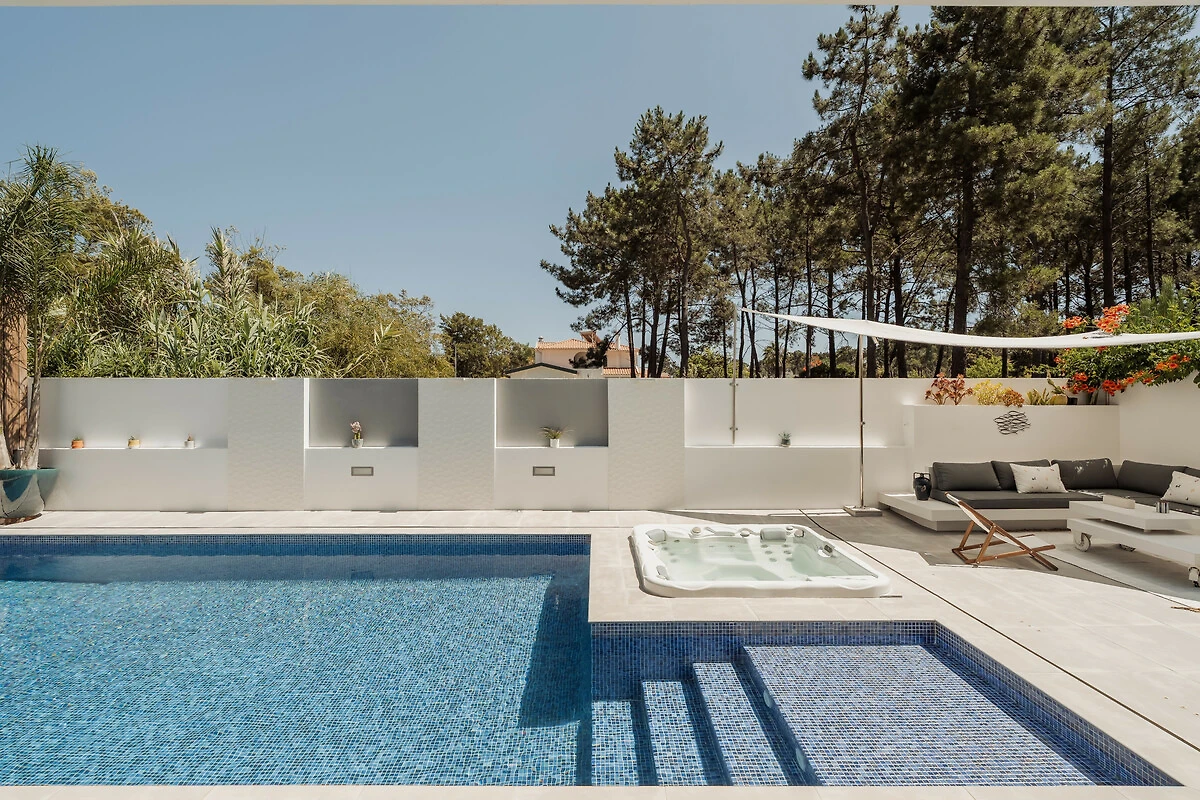 Il giardino privato e l'area della piscina sono progettati per il relax e l'intrattenimento. La piscina, arricchita da una vasca idromassaggio, offre la cornice perfetta per rilassarsi sotto il sole. Ampie aree decorate con pedane, lettini e sedute esterne permettono agli ospiti di godersi momenti di pace circondati dalla natura. Che si tratti di sdraiarsi a bordo piscina, gustare un pasto all'aperto o semplicemente immergersi nell'ambiente sereno, questa villa è la fuga ideale.