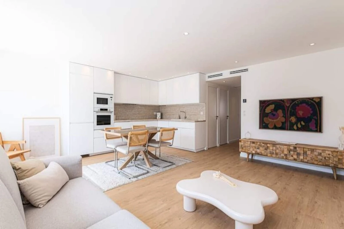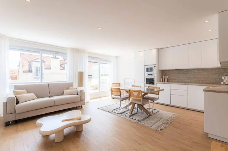 Lo spazioso appartamento dispone di un luminoso soggiorno che si apre su un'ampia terrazza soleggiata, perfetta per godersi il clima mediterraneo. Comprende una cucina completamente attrezzata e due camere da letto, ciascuna con il proprio bagno privato con doccia. Una camera è arredata con un letto matrimoniale, mentre la seconda offre due letti singoli che possono essere uniti per formare un letto matrimoniale. Un divano letto nel soggiorno può ospitare fino a sei persone in totale.