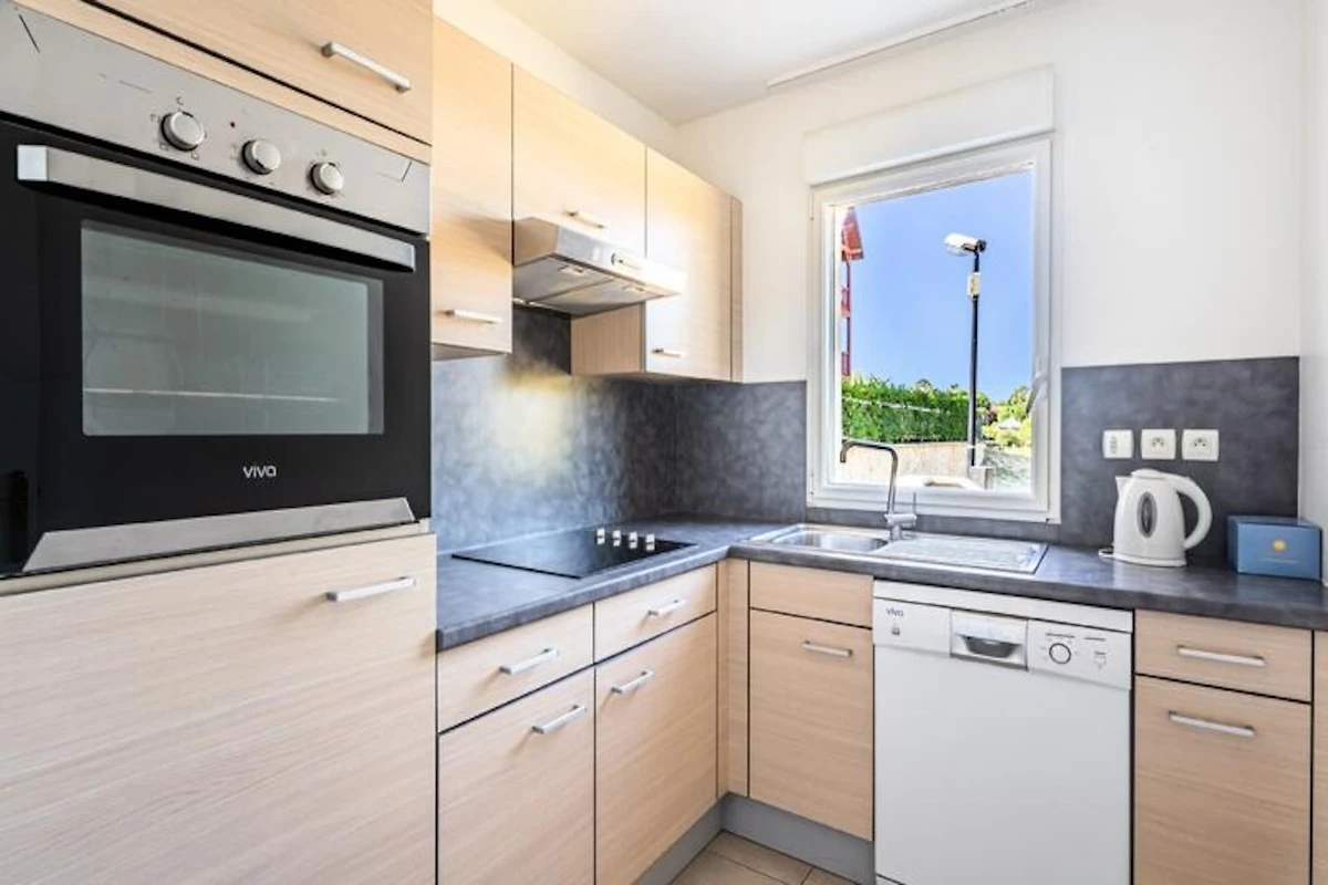 L'appartamento comprende una cucina chiusa dotata degli elettrodomestici essenziali, che vi permetterà di preparare i pasti durante il vostro soggiorno. Il bagno è dotato di vasca con colonna doccia, completata da servizi igienici separati per una maggiore comodità. Servizi aggiuntivi, come WiFi, biancheria e pulizia di fine soggiorno, sono disponibili per un'esperienza senza interruzioni. Questa proprietà luminosa e ben tenuta è la base perfetta per una rilassante vacanza sulla costa.