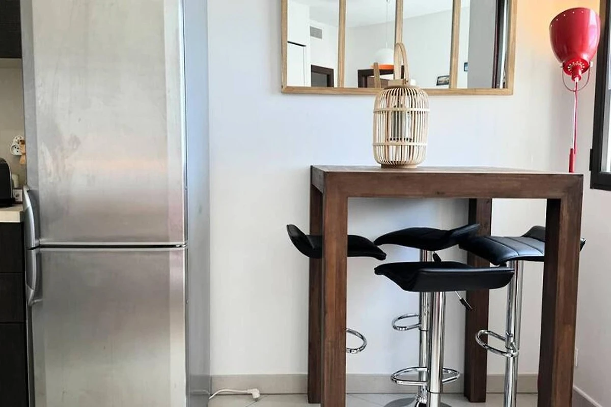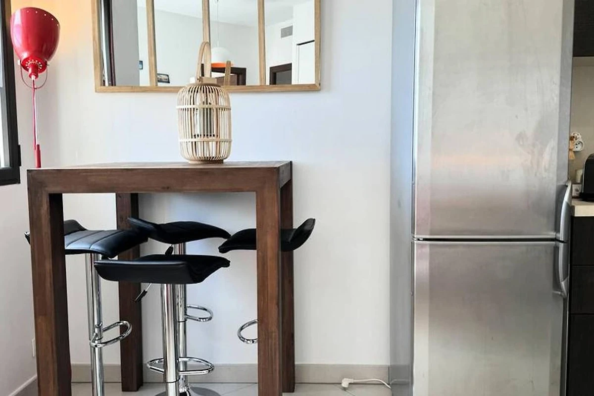 Questo elegante appartamento offre un layout confortevole e spazioso, dotato di un ampio soggiorno con cucina a vista, zona pranzo e una zona notte con letto matrimoniale. Un divano letto ט disponibile per altri due ospiti e, se necessario, c'ט ancora spazio per un letto supplementare. L'appartamento ט completamente climatizzato, con accesso internet gratuito e tutta la biancheria (lenzuola e asciugamani) fornita. ָ uno spazio in cui sono ammessi animali domestici e feste, con un deposito di € 700 richiesto all'arrivo. Il residence ט sicuro e offre un ampio parcheggio per i residenti.