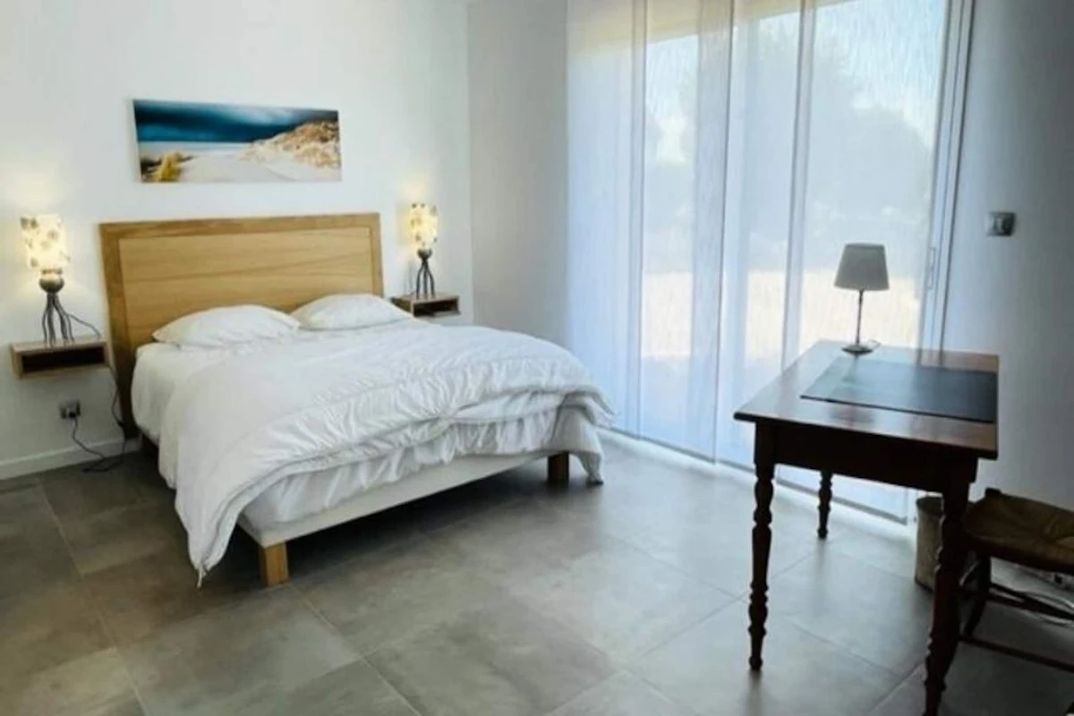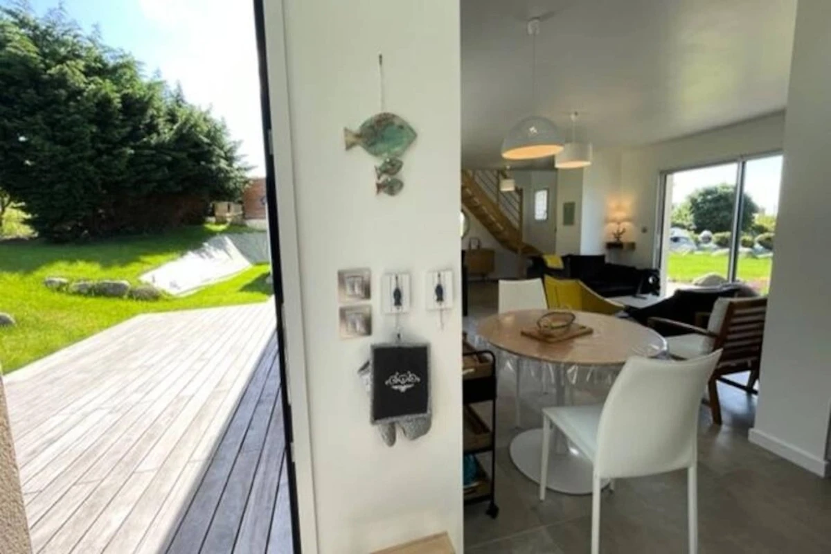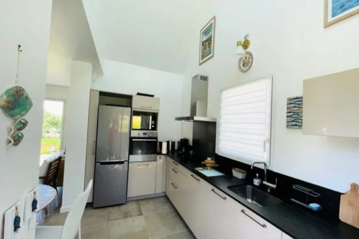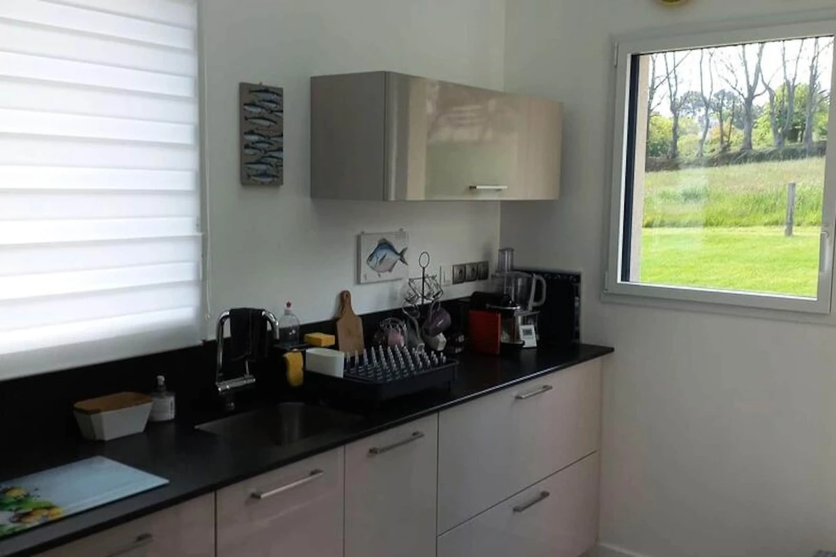 Induktionskochfeld, Elektroherd, Mikrowelle, Kühl-Gefrierkombination, Geschirr und Besteck, elektrische Kaffeemaschine, Geschirrspüler, Toaster, Wasserkocher, Fernseher, Sofa und Sessel, 4G-Internetbox, Tische und Stühle für Mahlzeiten, 2 Betten 160x200 cm, 2 Betten 80x200 cm (kombinierbar), Arbeitsbereich (Schlafzimmer im Erdgeschoss), Gartenmöbel, großer Sonnenschirm und Grill. Waschmaschine in der angeschlossenen Garage.