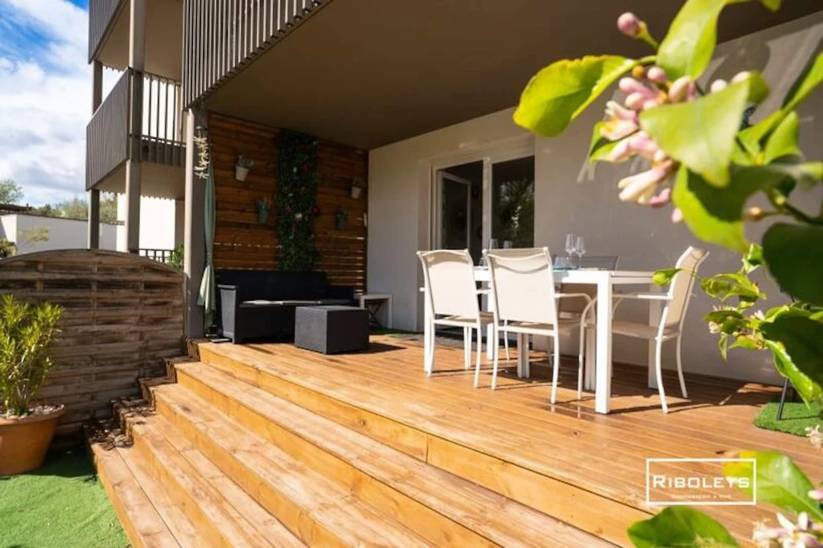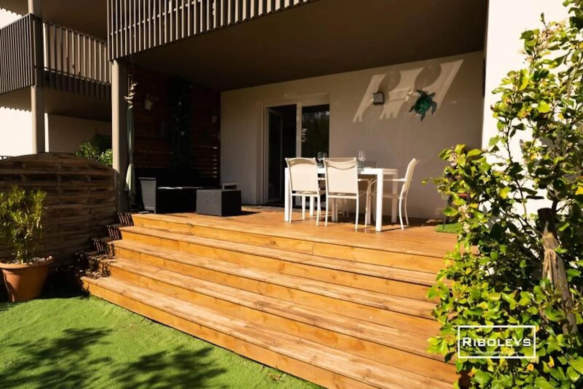 Ideal gelegen in einer neuen Lodge-Residenz mit Gemeinschaftspool, Spielplatz und Obstgarten. Die Unterkunft verfügt über 1 privaten Parkplatz sowie eine große Garage. sicheres Fahrrad.