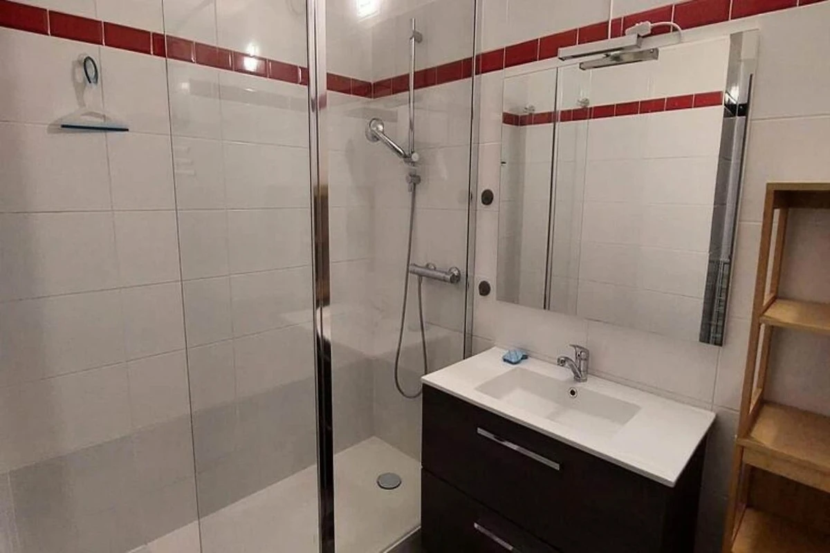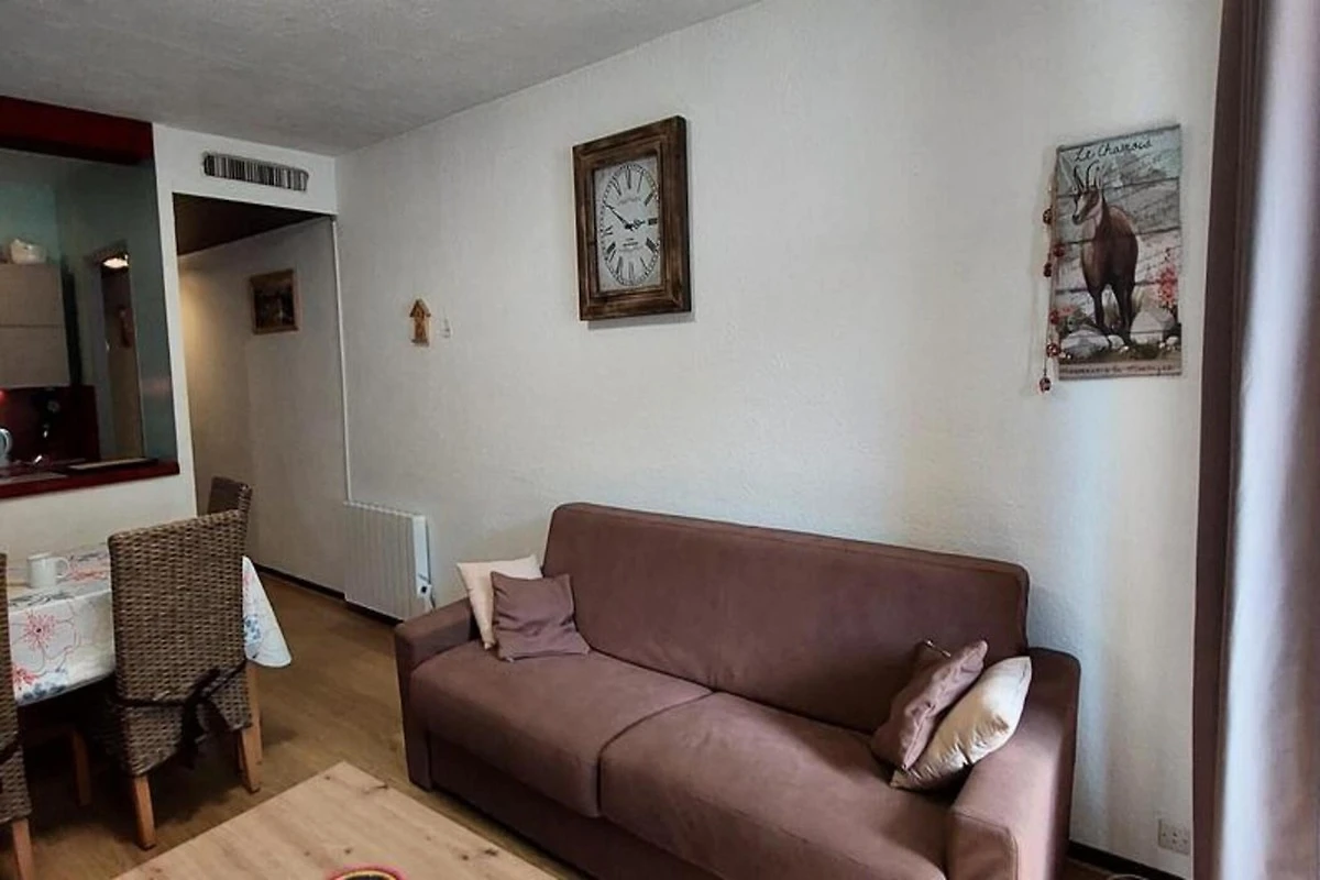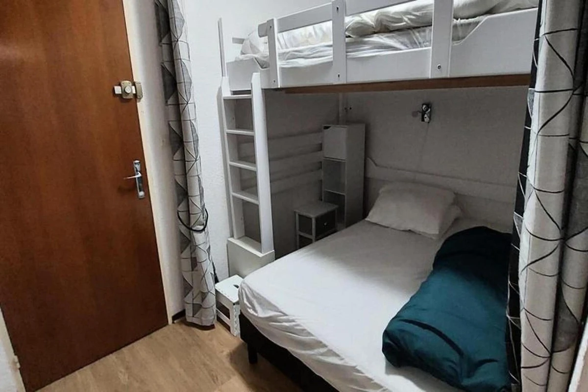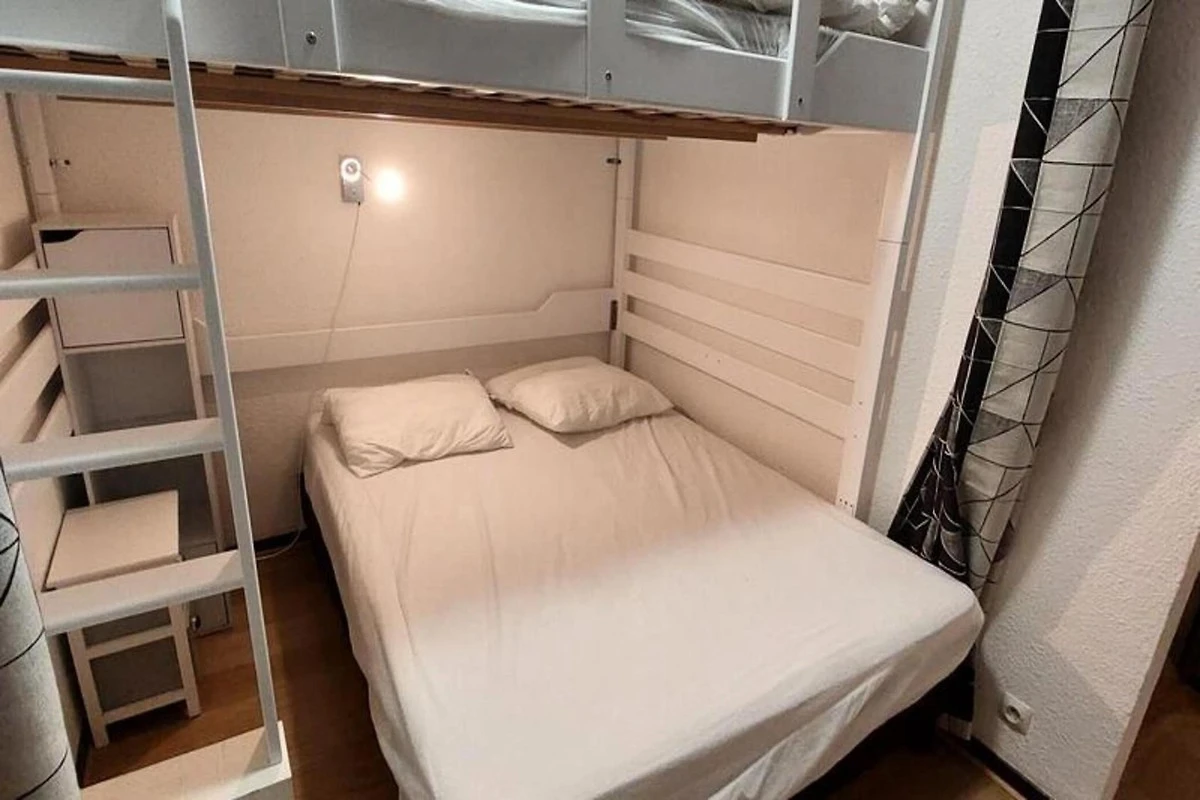Questo monolocale di 36 m² può ospitare fino a 4 persone e si trova al 1° piano con balcone esposto a ovest. È dotato di un soggiorno con TV, divano e zona pranzo, nonché di una zona notte con un divano letto (letto matrimoniale da 160 cm) e due letti a castello matrimoniali. La zona notte è separata da una tenda e il letto superiore non è adatto a bambini di età inferiore a 6 anni. La struttura non accetta animali domestici ed è disponibile un armadio per gli sci, oltre all'accesso al parcheggio collettivo (soggetto a disponibilità).