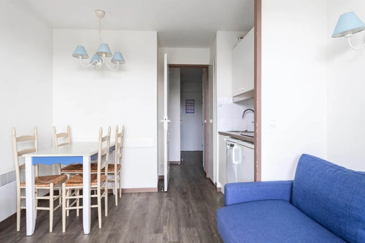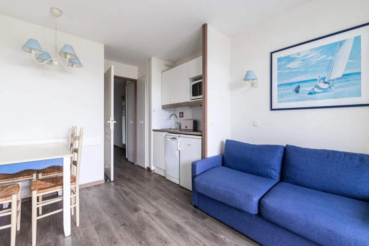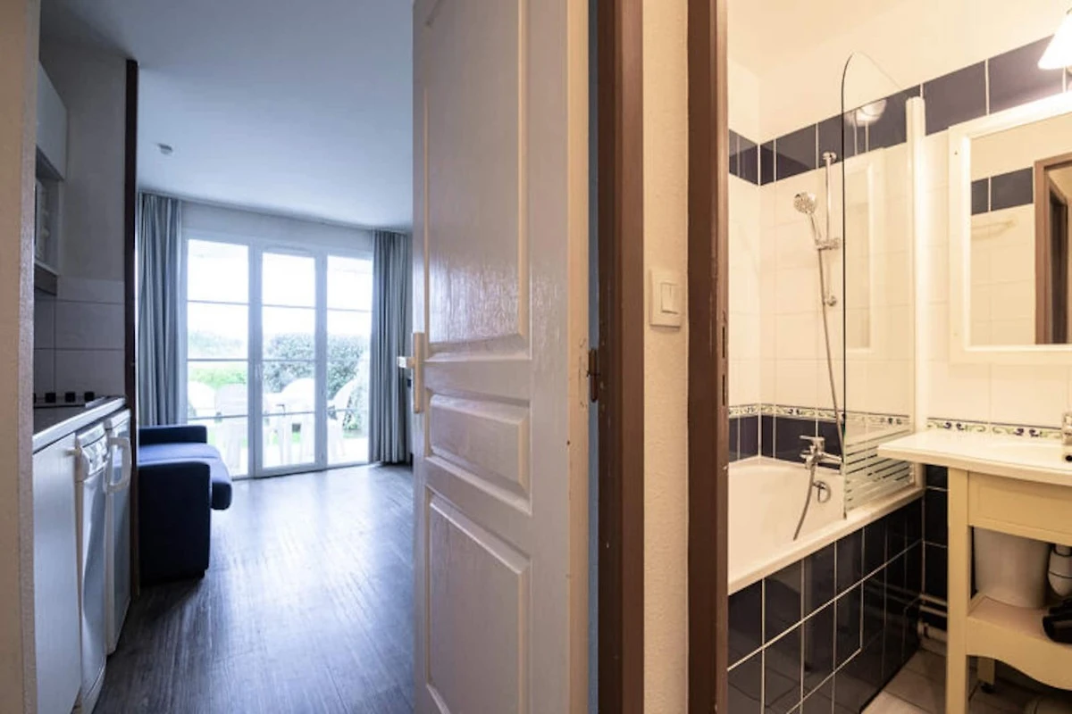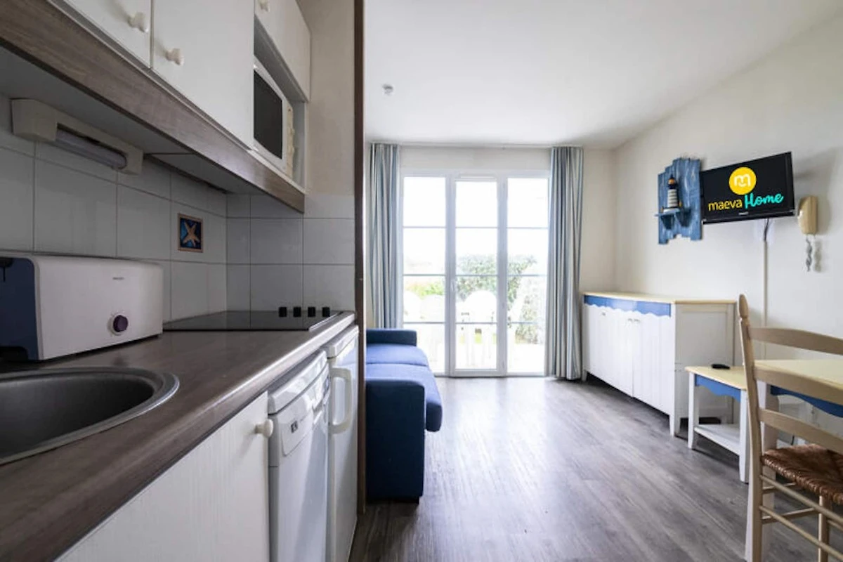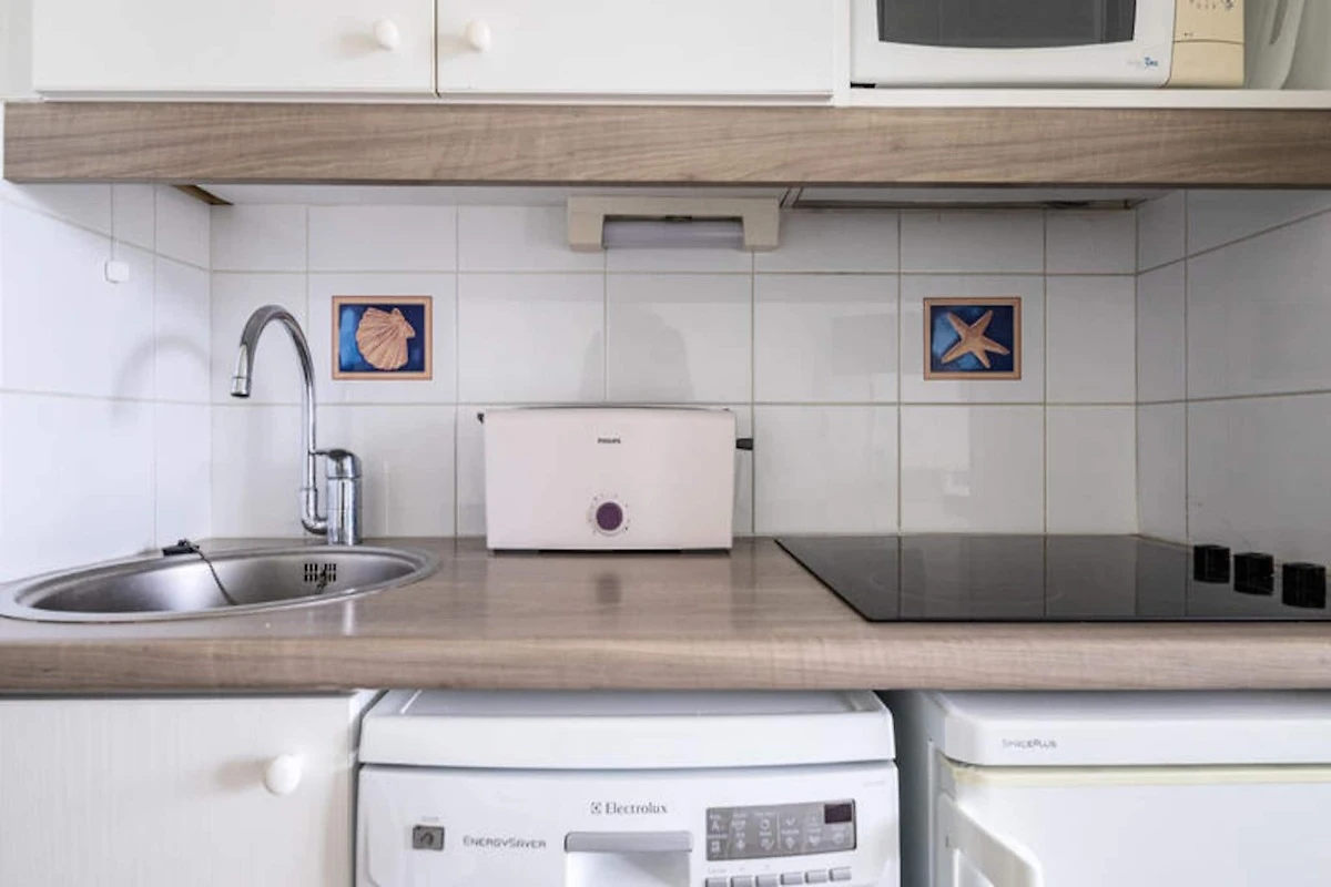 L'appartamento comprende una cucina aperta in stile americano con quattro posti a sedere ed elettrodomestici essenziali. Il soggiorno si apre su una terrazza privata e il bagno ben curato è dotato di doccia. Gli ospiti potranno inoltre usufruire dell'accesso ad una piscina in comune, aperta da giugno a settembre, per aggiungere ulteriore relax al vostro soggiorno.