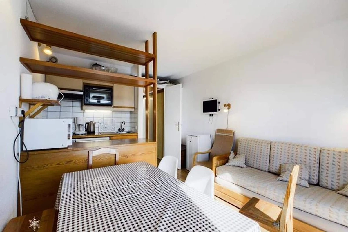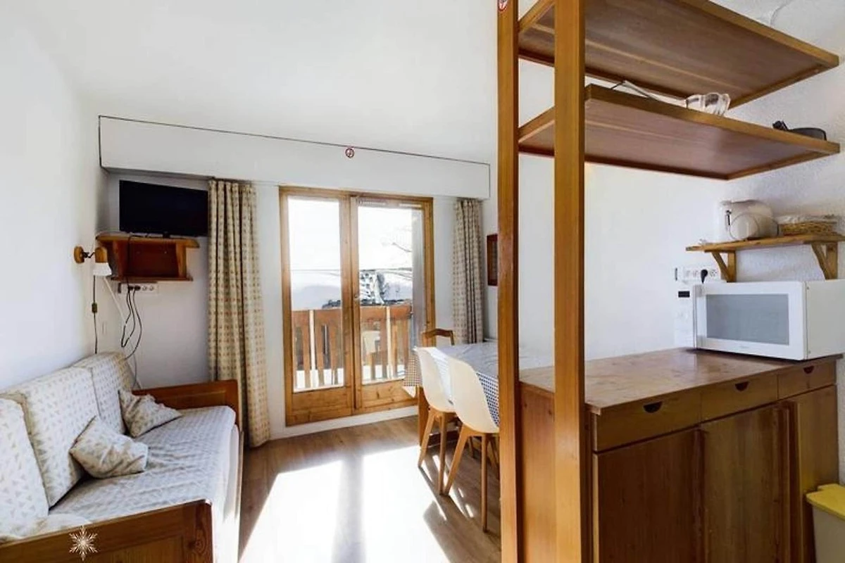 Questo accogliente monolocale di 29 m², situato al piano del giardino di una residenza tranquilla, puע ospitare fino a 6 persone. Lo spazio comprende un soggiorno con divano letto per due, una cabina con due letti a castello e un ingresso con un ulteriore set di letti a castello. Un bagno con WC separato garantisce una maggiore comoditא. L'esposizione a sud-ovest e il balcone regalano una vista incantevole, perfetta per rilassarsi dopo una giornata sulle piste. L'appartamento non accetta animali domestici e non include la moquette, il che lo rende un'opzione pulita e adatta agli allergici.