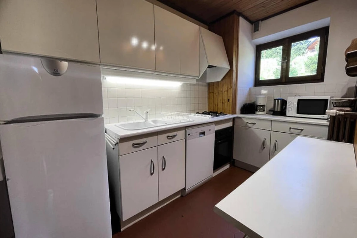 L'appartamento comprende una cucina completamente attrezzata con gli elettrodomestici essenziali, tra cui fornello a gas, forno, microonde, lavastoviglie e frigorifero con congelatore da 200 litri. È inoltre fornito di macchine per raclette e fonduta, offrendo agli ospiti l'opportunità di gustare piatti tradizionali savoiardi. Una lavanderia è dotata di lavatrice, asciugatrice e ferro da stiro, garantendo comodità durante tutto il soggiorno. La struttura dispone di armadietti per gli sci per riporre l'attrezzatura e, in estate, gli ospiti possono usufruire di strutture all'aperto come altalene, tavolo da ping-pong e bocce. Inoltre, presso lo chalet è disponibile un parcheggio privato esterno. Utenze essenziali come riscaldamento elettrico, acqua ed elettricità sono incluse, anche se i noleggi a lungo termine vengono fatturati in base all'utilizzo.