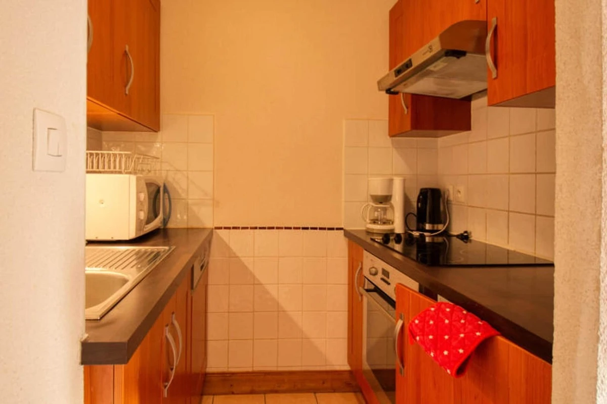 L'appartamento dispone di una cucina completamente attrezzata con frigorifero, lavastoviglie, piano cottura in vetroceramica, forno, microonde, macchina per il caffט e bollitore elettrico, che vi consentirא di preparare deliziosi pasti. L'ampia zona giorno si apre su un balcone esposto a sud con mobili da giardino, ideale per rilassarsi dopo una giornata sulle piste.