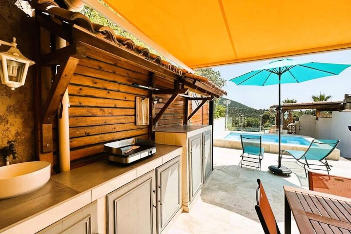Immerso in un ambiente naturale sereno, questo affascinante Mazet offre un rifugio tranquillo a breve distanza dal Mar Mediterraneo. La proprietà comprende due camere da letto climatizzate, una con due letti singoli e l'altra con un letto matrimoniale, entrambe con splendida vista sul mare. La cucina completamente attrezzata e l'accogliente soggiorno garantiscono un soggiorno confortevole con comfort moderni come TV, Wi-Fi e forno elettrico. Il Mazet è l'ideale per una famiglia o un piccolo gruppo che desidera godersi la tranquillità e la natura. Una piscina privata e una cucina esterna con plancha grill e frigorifero consentono un perfetto relax.