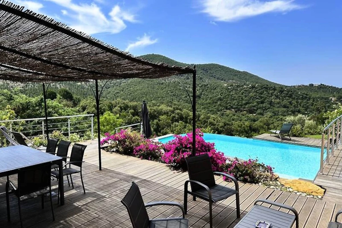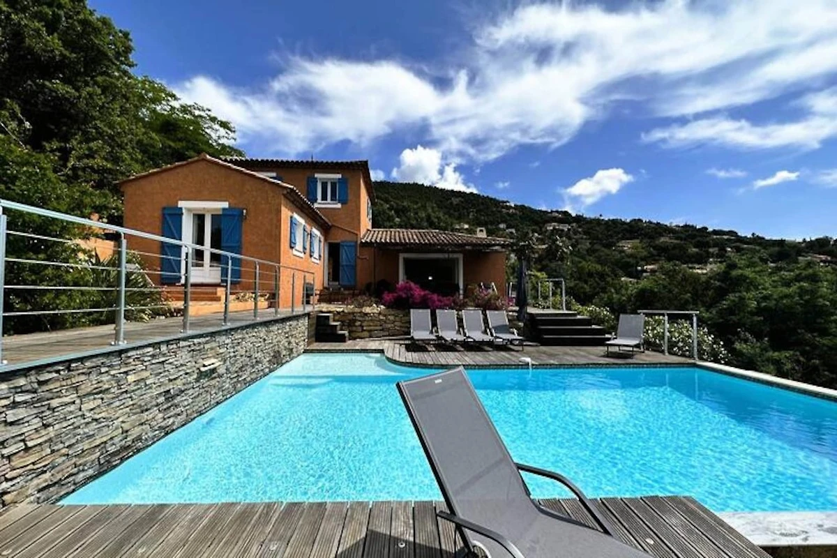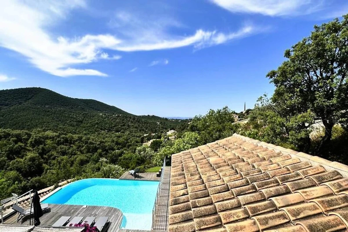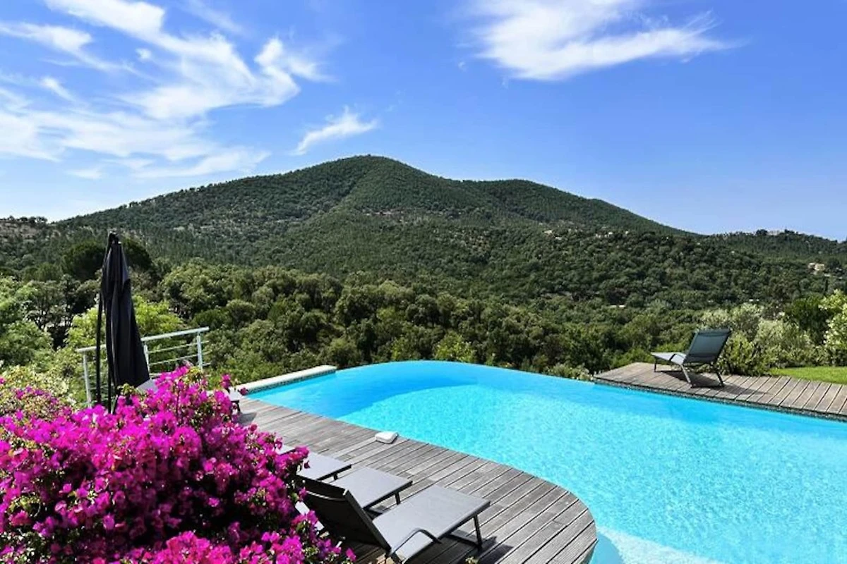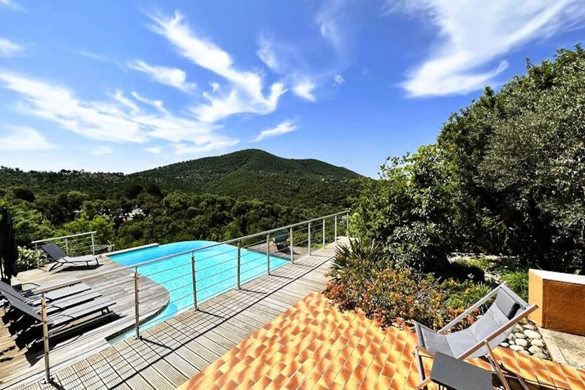 Immersa nel cuore del massiccio dei Maures, questa lussuosa villa offre una fuga indimenticabile circondata da rigogliose colline verdi e viste mozzafiato sul mare. Completamente climatizzata, la struttura dispone di un ampio soggiorno che si apre su terrazze in legno e un'invitante piscina a sfioro. Può ospitare fino a dieci ospiti, comprende una master suite con letto queen-size e accesso alla terrazza privata, due camere da letto al piano superiore (una matrimoniale e una doppia) che condividono un bagno con doccia e una dependance indipendente con due camere da letto aggiuntive, ciascuna con bagno privato. -bagno privato. Questa struttura è per non fumatori, non accetta animali domestici e non è adatta a bambini piccoli o persone con mobilità ridotta.