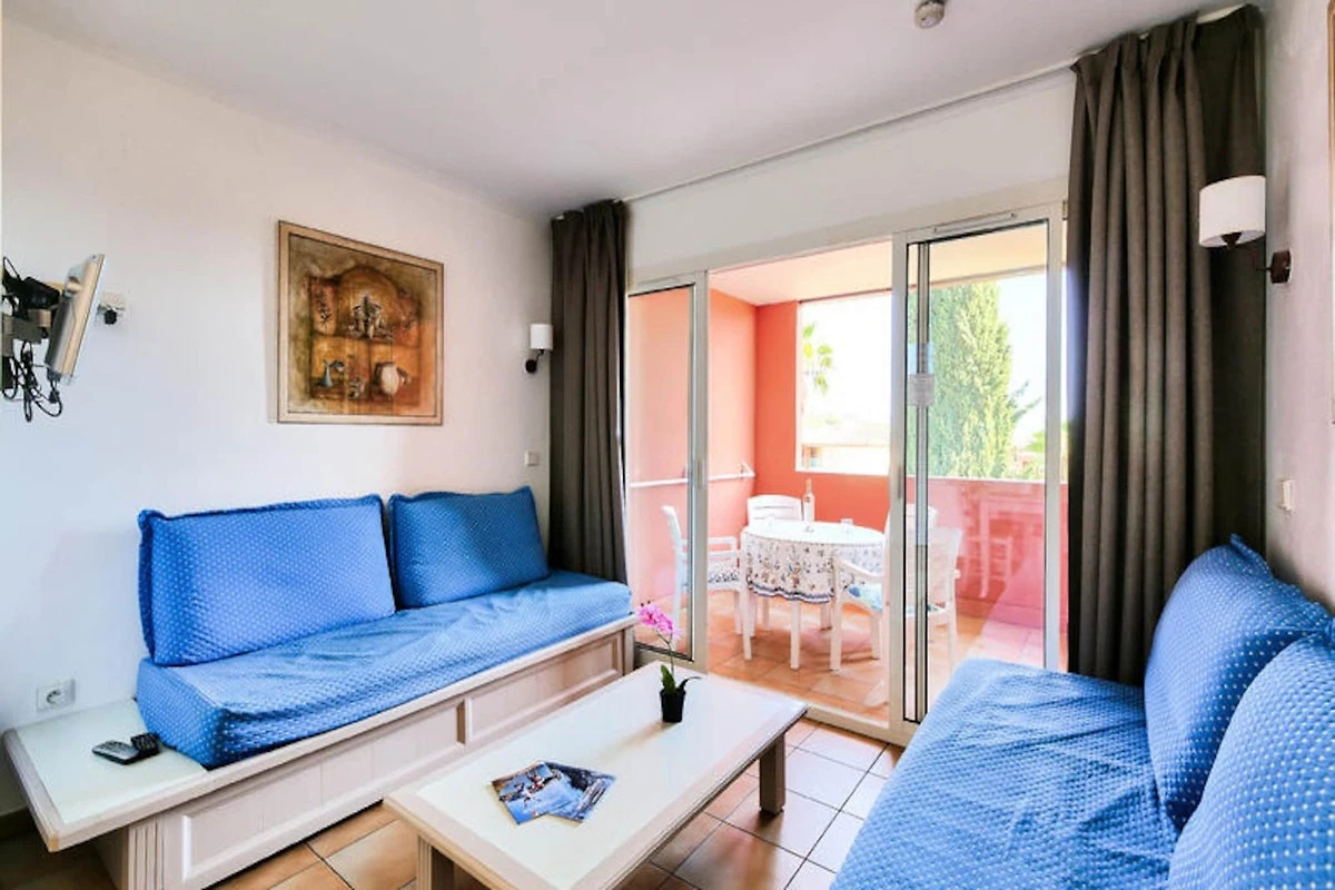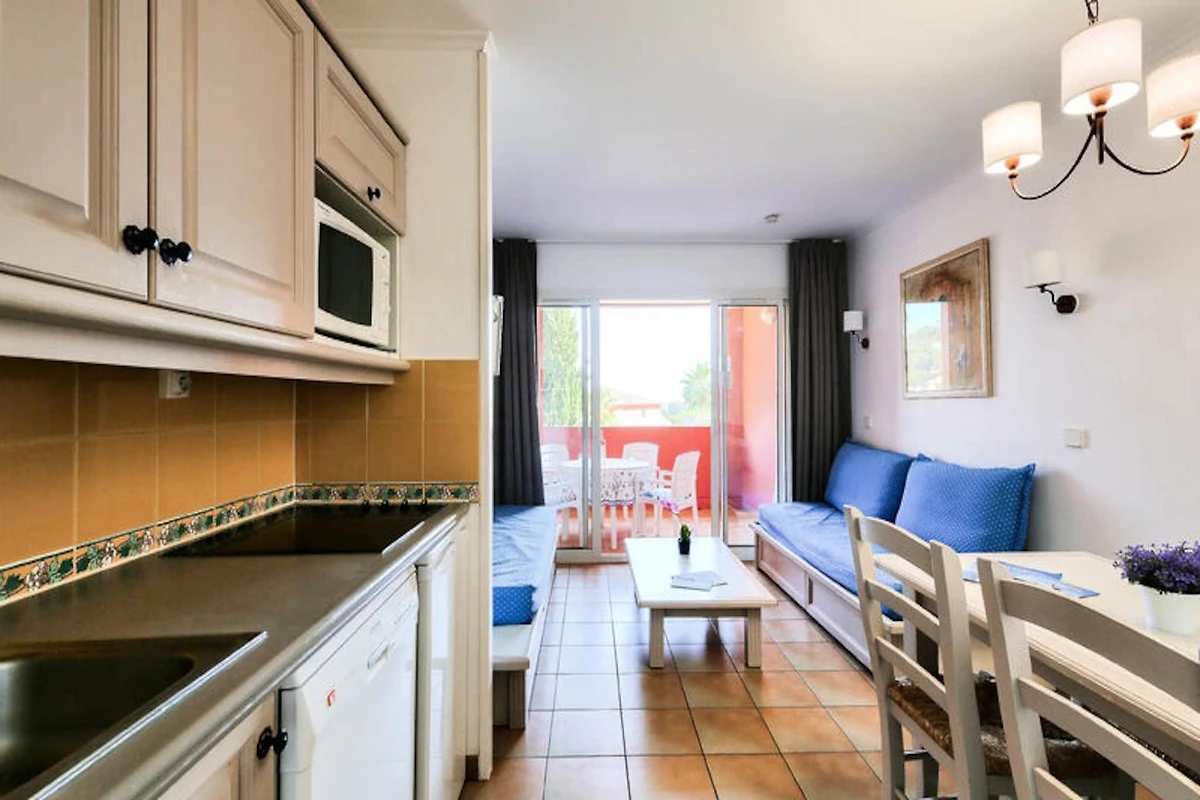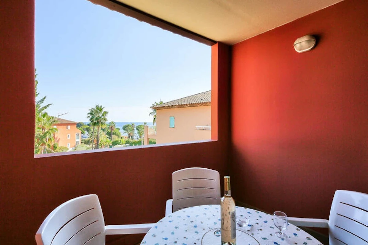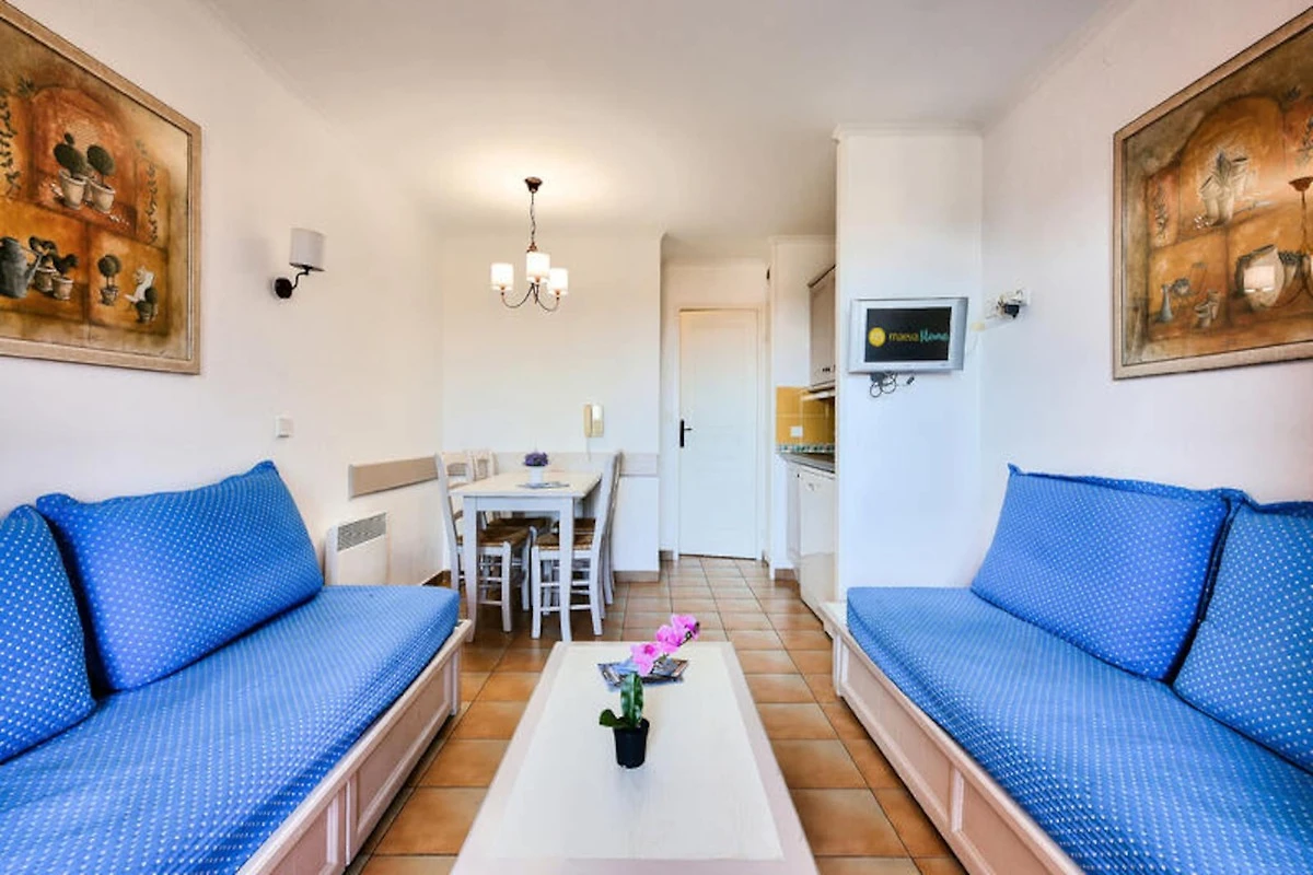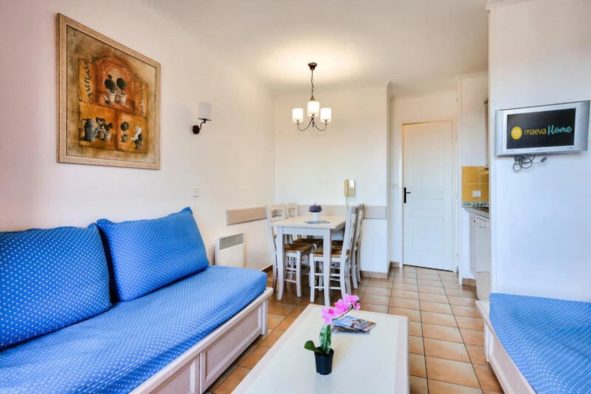 L'appartamento offre 30 m² di spazio ben progettato, situato al secondo piano. Comprende un soggiorno con divano letto, una cucina con zona pranzo all'americana, una camera con letto matrimoniale e un bagno con vasca. L'appartamento dispone anche di un balcone con vista sul mare, esposto a sud-est, che offre il luogo perfetto per rilassarsi. Il parcheggio è disponibile per la vostra comodità e la posizione privilegiata del residence vi garantisce di essere vicini al centro del paese e a una varietà di attività locali, tra cui immersioni, tennis, vela e golf.