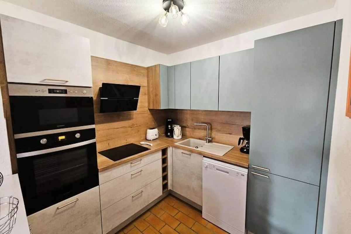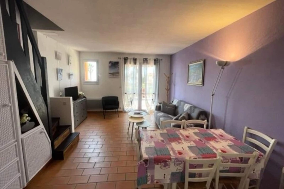 L'appartamento duplex comprende un ampio soggiorno che si apre su una cucina a vista completamente attrezzata, una lavanderia e un WC al piano terra. Al piano superiore ci sono due bagni e servizi igienici separati oltre alle camere da letto e al balcone. I servizi includono TV, lavatrice, lavastoviglie, forno, microonde, piano cottura a induzione, cappa aspirante, frigorifero con congelatore, due macchine da caffè (Senseo e filtro), bollitore, tostapane e plancha. Sono inoltre forniti mobili da giardino, tenda da sole manuale, asse e ferro da stiro, stendino e aspirapolvere. Lenzuola, asciugamani e pulizia di fine soggiorno non sono inclusi ma possono essere aggiunti a un costo aggiuntivo.