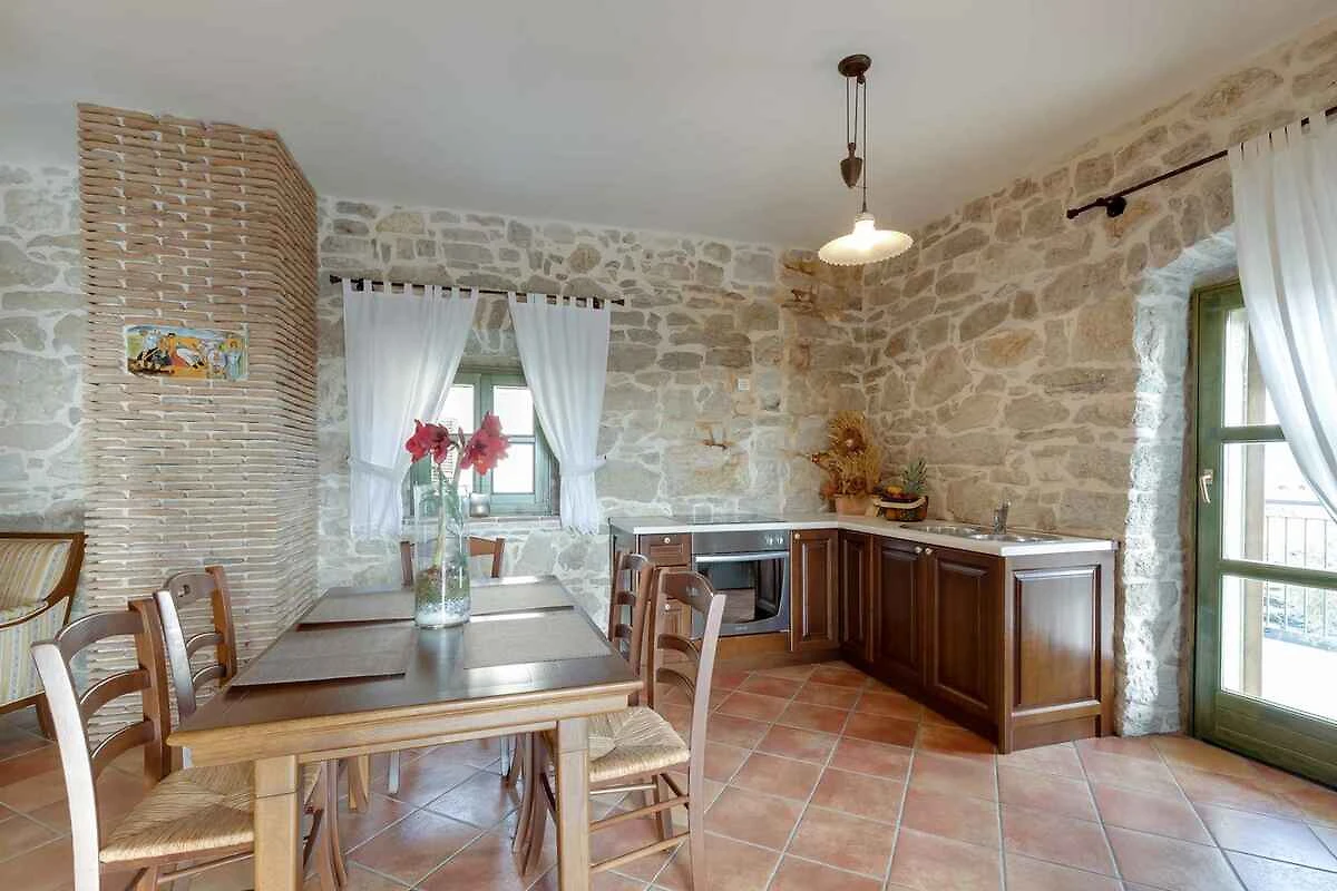 Piano terra: Sala da pranzo con aria condizionata, camino, zona pranzo (10 posti) e (Al piano terra della casa si trova una taverna climatizzata con un grande camino aperto per grigliare, una cucina attrezzata, un grande tavolo per 10 persone e un bagno separato). Angolo cottura con fornello a gas, forno, lavastoviglie, frigorifero, microonde e tostapane. WC separato con 1 lavabo e WC.