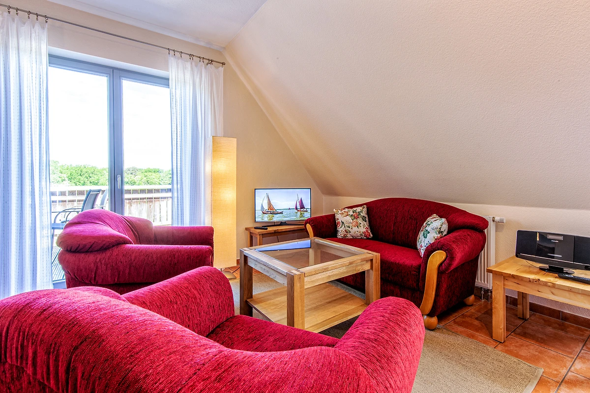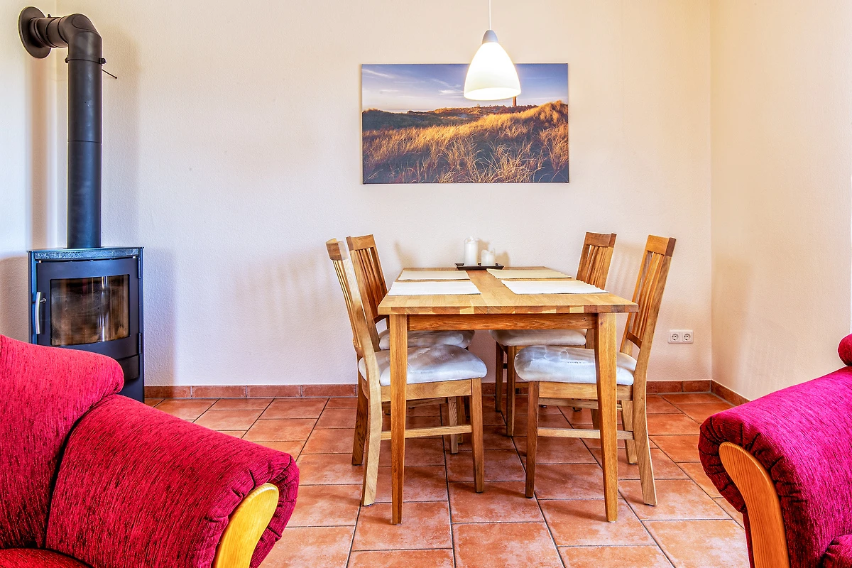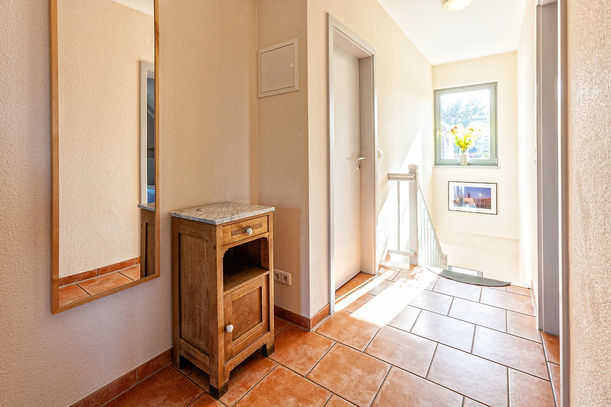Al piano terra l'appartamento dispone di un ingresso indipendente con un guardaroba. L'area abitativa vera e propria al primo piano è raggiungibile tramite una scala. Il soggiorno e la sala da pranzo con un angolo cottura moderno dotato di forno e lavastoviglie, nonché la televisione con ricezione satellitare e un piccolo impianto hi-fi, costituiscono il locale centrale dell’appartamento per le vacanze. Una stufa a legna fornisce calore aggiuntivo. Dal soggiorno e dalla sala da pranzo si accede direttamente alla grande terrazza sul tetto e si può godere della vista sul porto. L’appartamento dispone di due camere da letto separate. Nella più grande si trova un accogliente angolo lettura. Anche da questa stanza si accede alla terrazza sul tetto. La camera da letto più piccola è dotata di due letti singoli.