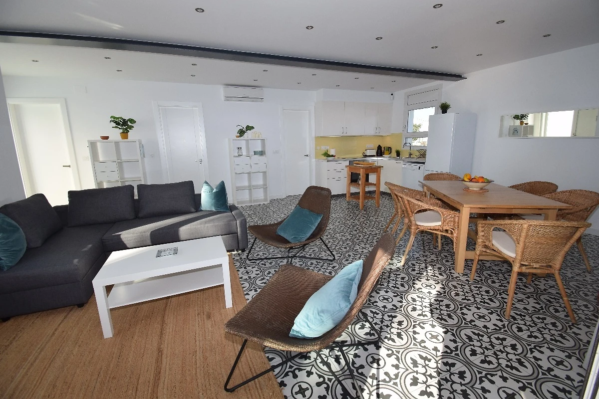 Ampio soggiorno e sala da pranzo con cucina a vista, aria condizionata, arredamento moderno e TV satellitare, oltre all’accesso alla terrazza coperta superiore e al giardino.
