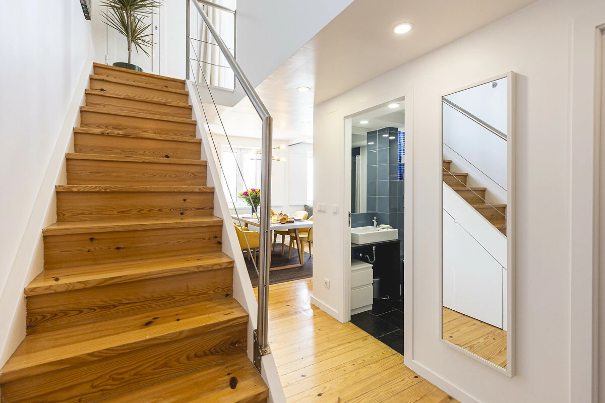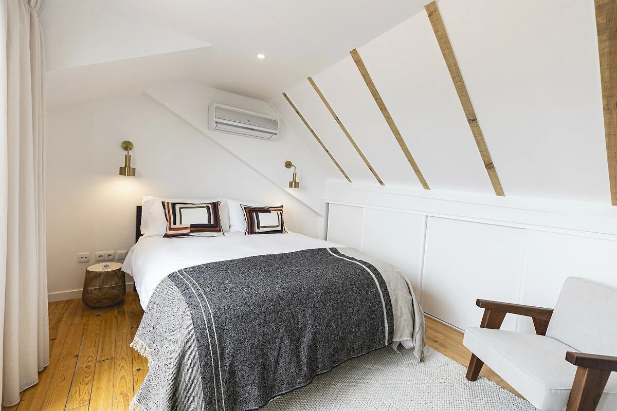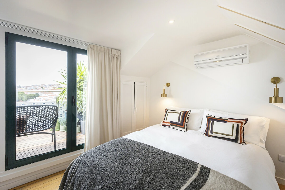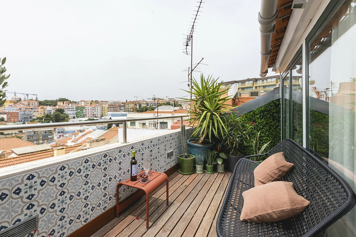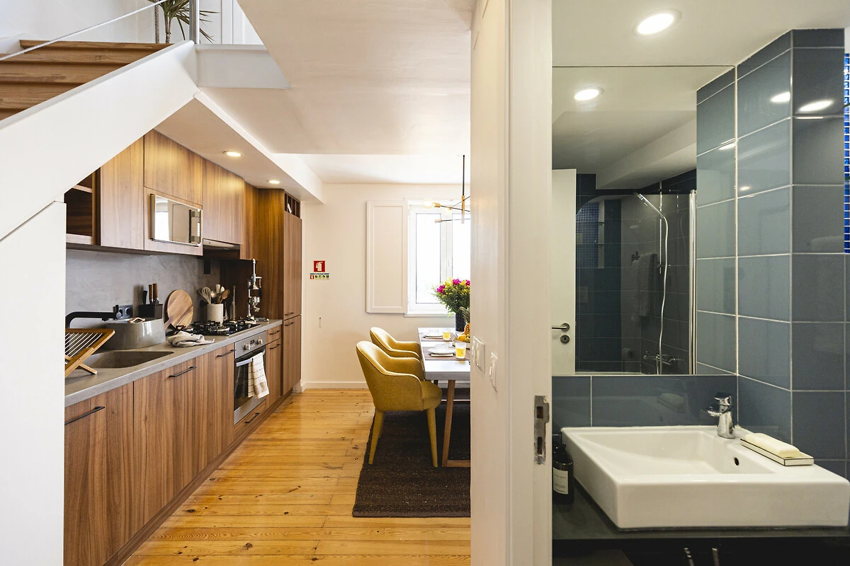 Soft yellow chairs are positioned around the table, adding a cheerful feeling to the apartment. The bathrooms are in keeping the rest of the flat: modern, comfortable and stylish. Different shades of blue tiling are juxtaposed with the white amenities to create a feeling of utter cleanliness. The roof terrace is arguably this flat’s most amazing feature, with a bench for you to sit on and enjoy your morning coffee or an evening sundowner whilst watching the world go past and the sea in the background. This apartment is comfortable, chic and accessible, and offers the most unforgettable spot to explore Lisbon from.