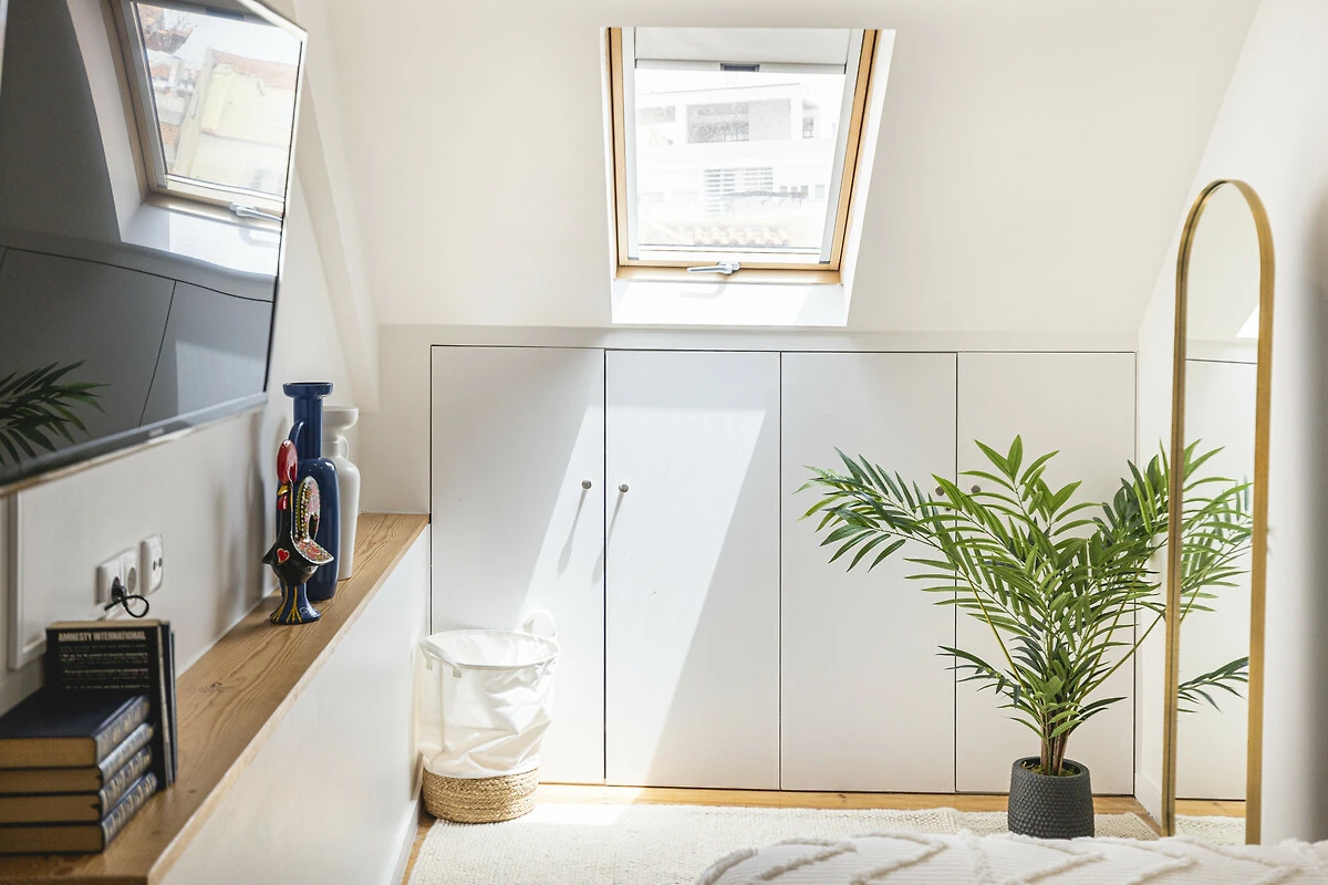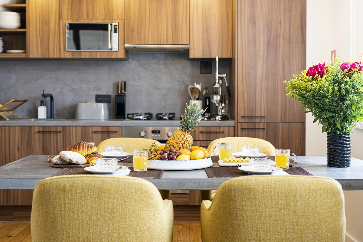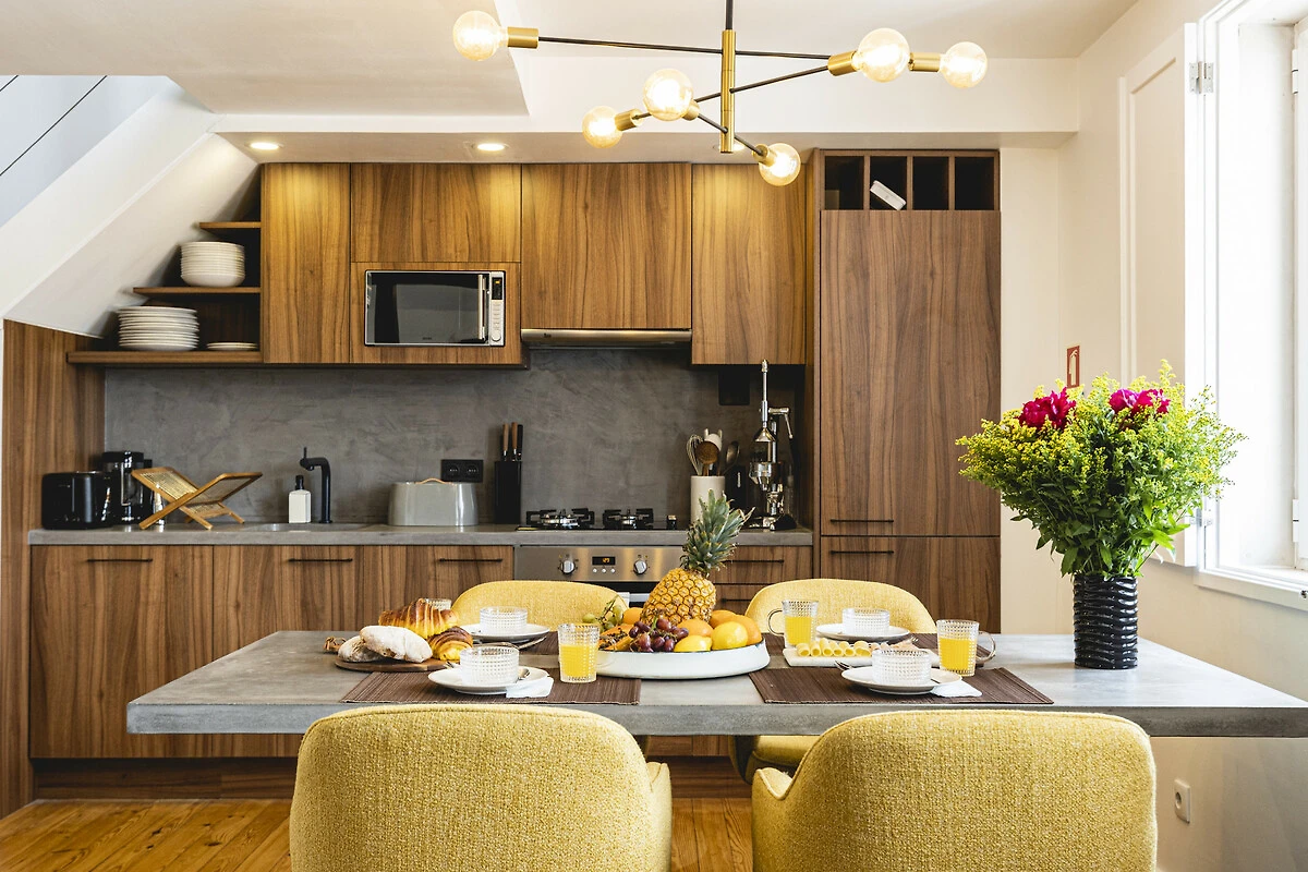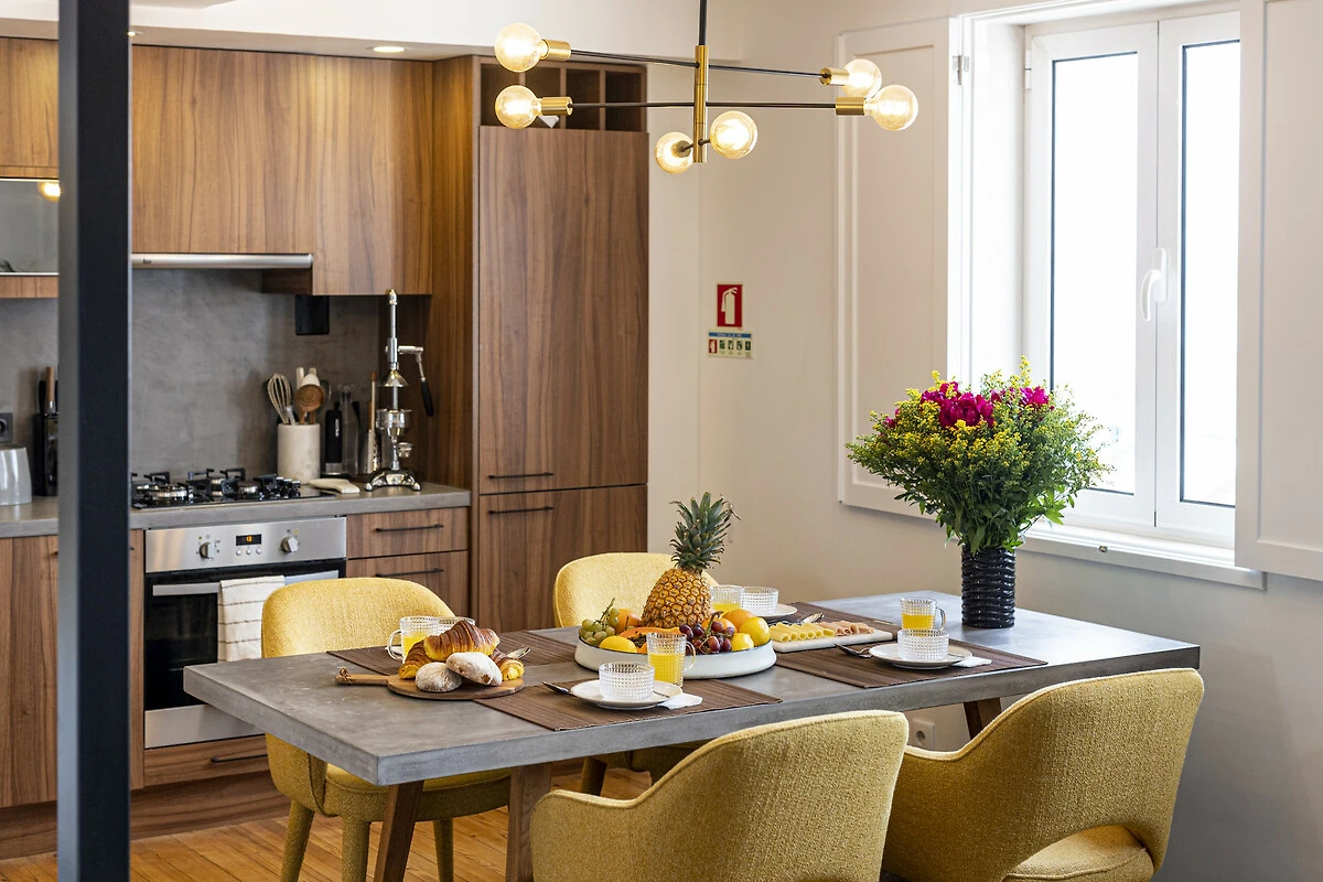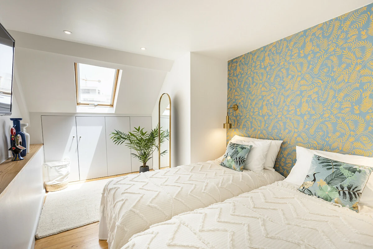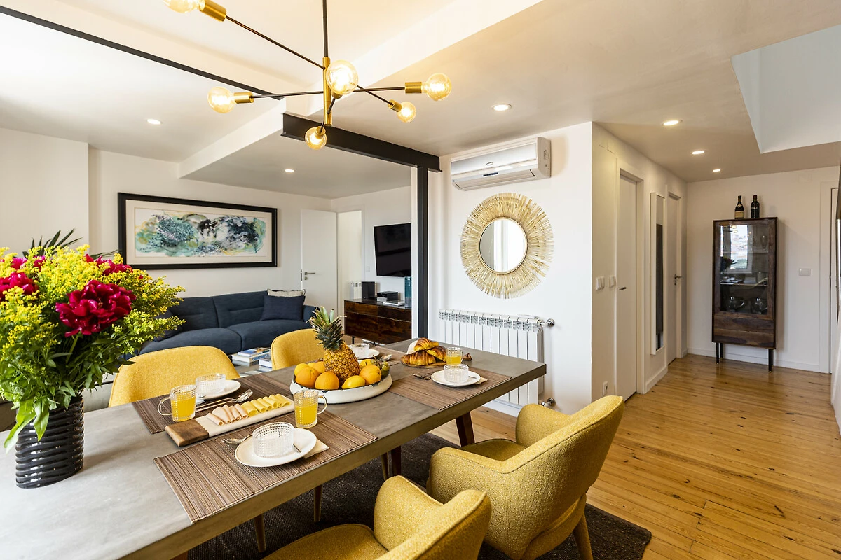 Soft yellow chairs are positioned around the table, adding a cheerful feeling to the apartment. The bathrooms are in keeping the rest of the flat: modern, comfortable and stylish. Different shades of blue tiling are juxtaposed with the white amenities to create a feeling of utter cleanliness. The roof terrace is arguably this flat’s most amazing feature, with a bench for you to sit on and enjoy your morning coffee or an evening sundowner whilst watching the world go past and the sea in the background. This apartment is comfortable, chic and accessible, and offers the most unforgettable spot to explore Lisbon from.