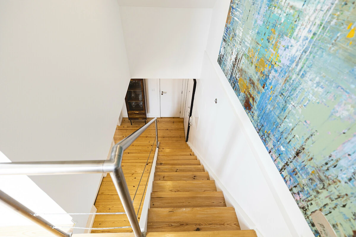 On the ground floor there is one room with a double bed and another with 2 singles. The third bedroom is on the first floor and is a double. The interiors are delightful: with exceptional wall printing in the bedrooms above the beds, carefully chosen bed furnishings to suit the colour scheme of each room and large windows allowing sunlight to filter into the apartment. Full length mirrors, flat screen TVs and modern light fixtures can be found throughout. The living area is chic and inviting, with a zebra print floor rug and spacious navy sofa.