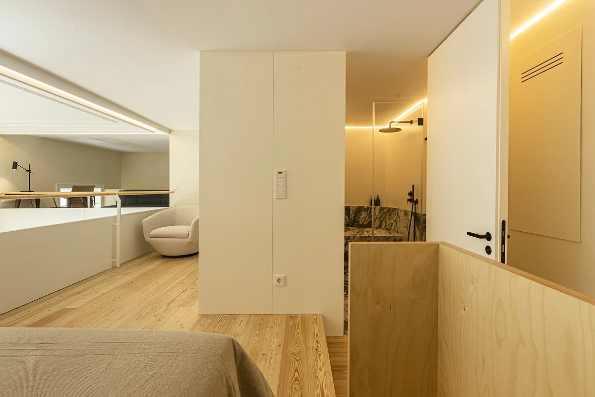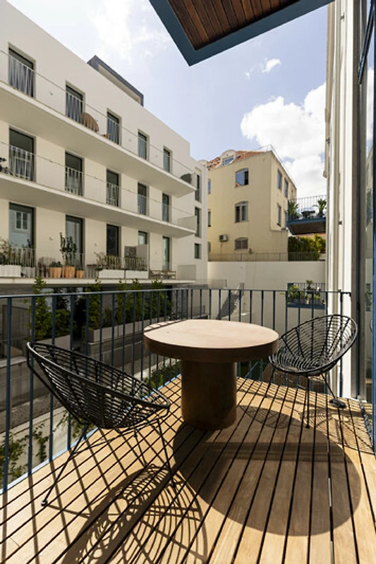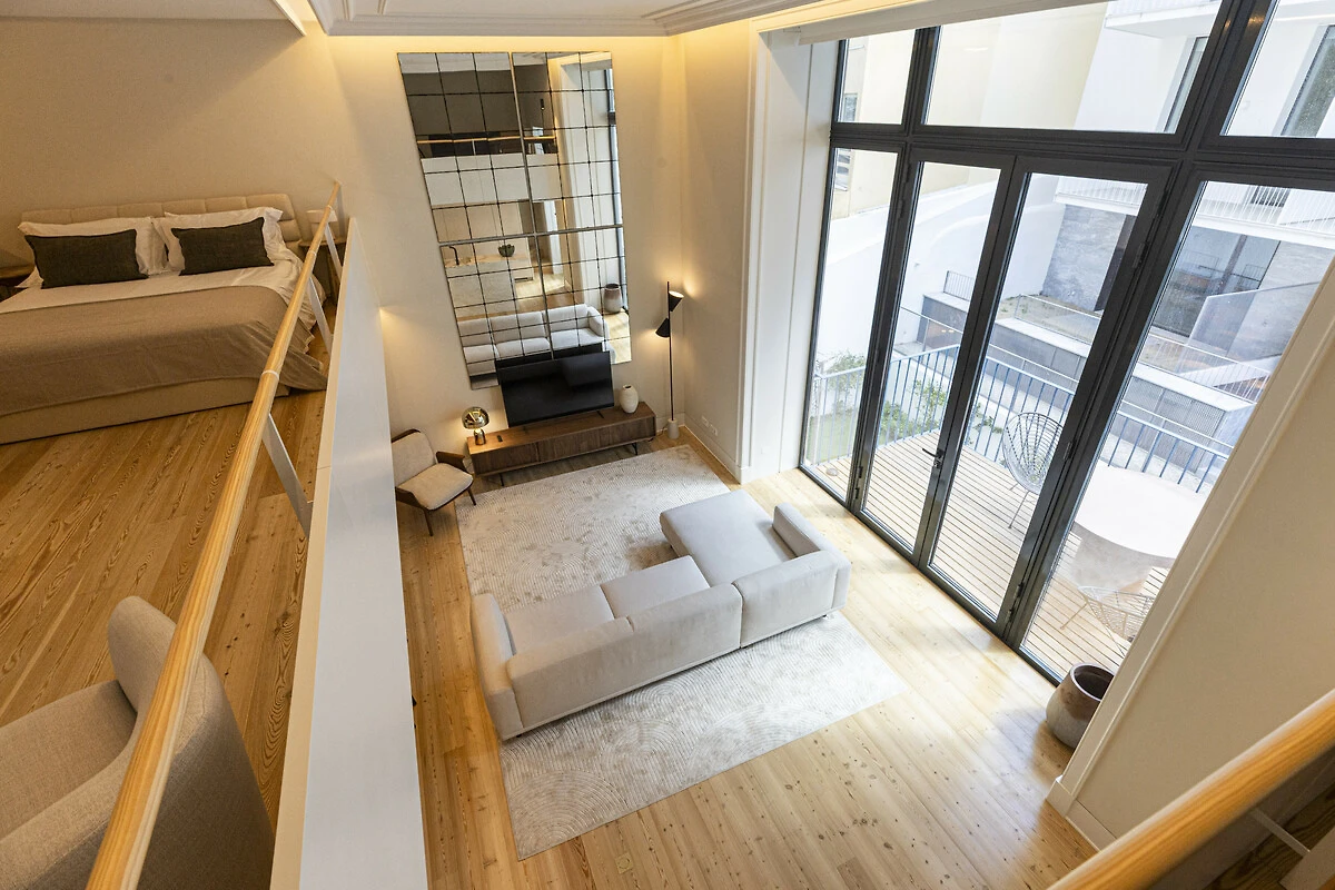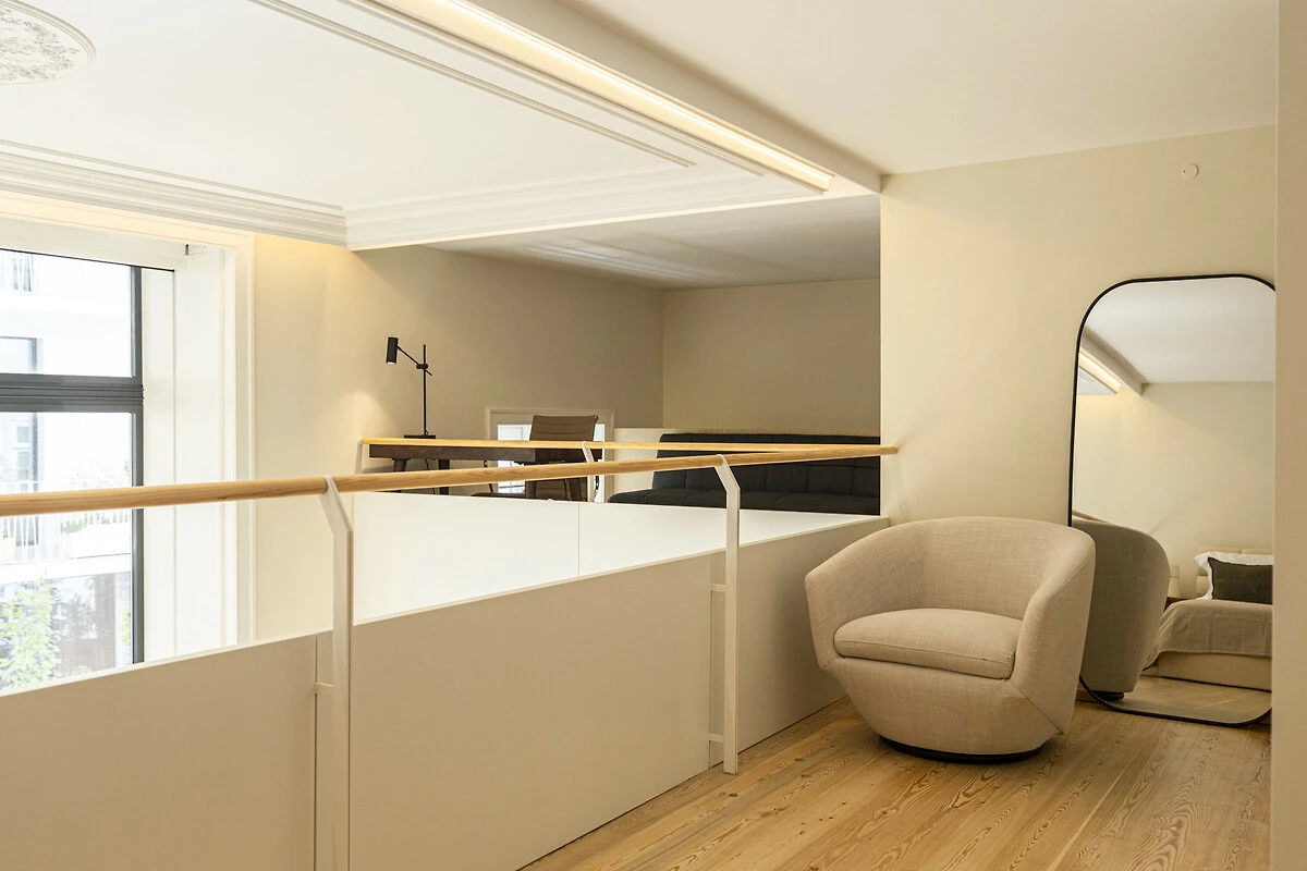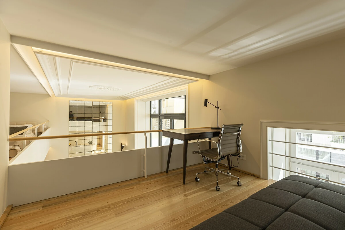 Un balcone privato si fonde armoniosamente con lo spazio living principale, ideale per un caffè mattutino tranquillo o un aperitivo serale. Quest'area esterna sopraelevata offre privacy e prospettiva, perfetta per godersi la luce soffice e le brezze gentili di Lisbona. La disposizione offre il lusso dell'indipendenza nel cuore della città. Il Loft di Lisbona permette agli ospiti di godere di piena autonomia e discrezione durante il loro soggiorno. Ogni dettaglio, dall'illuminazione alle finiture, è stato progettato per offrire comfort e armonia visiva in un ambiente residenziale esclusivo.