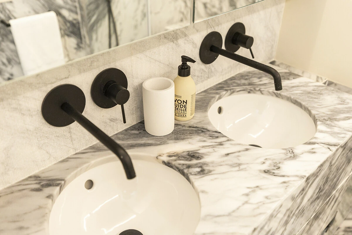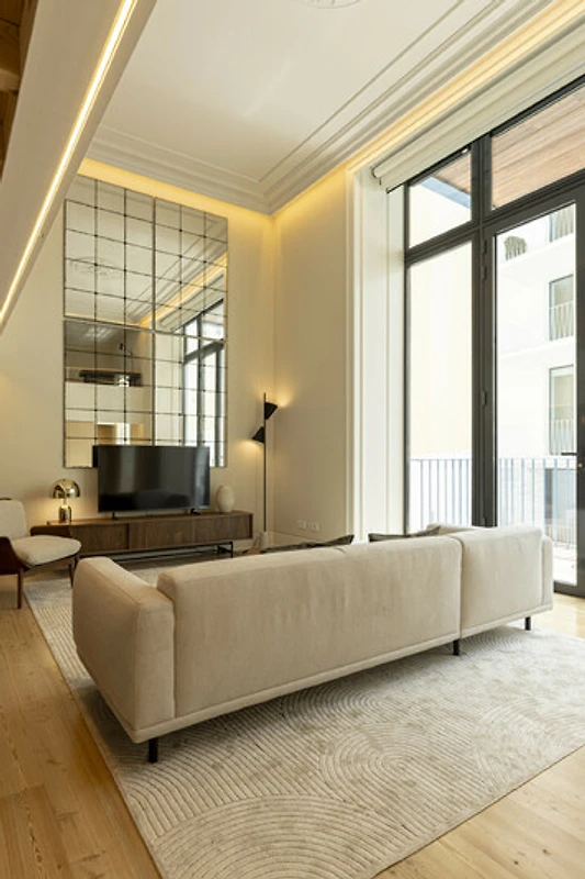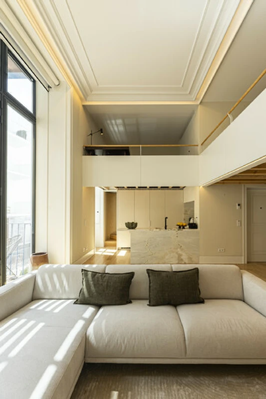 Distribuito su 125 metri quadrati, questa residenza in stile soppalco offre un generoso soggiorno open-plan e una verticalità sorprendente. Il design bilancia accuratamente i dettagli architettonici classici con finiture contemporanee, inclusi modanature del soffitto ornate e illuminazione scultorea. La camera da letto si trova al livello superiore del soppalco, con un letto matrimoniale e un divano letto di alta qualità che ospita comodamente due ospiti aggiuntivi. Una cucina completamente attrezzata e un'area pranzo curata completano l'ampio soggiorno con soffitti alti, immerso nella luce naturale e impeccabilmente arredato per la vita quotidiana e l'intrattenimento elegante.