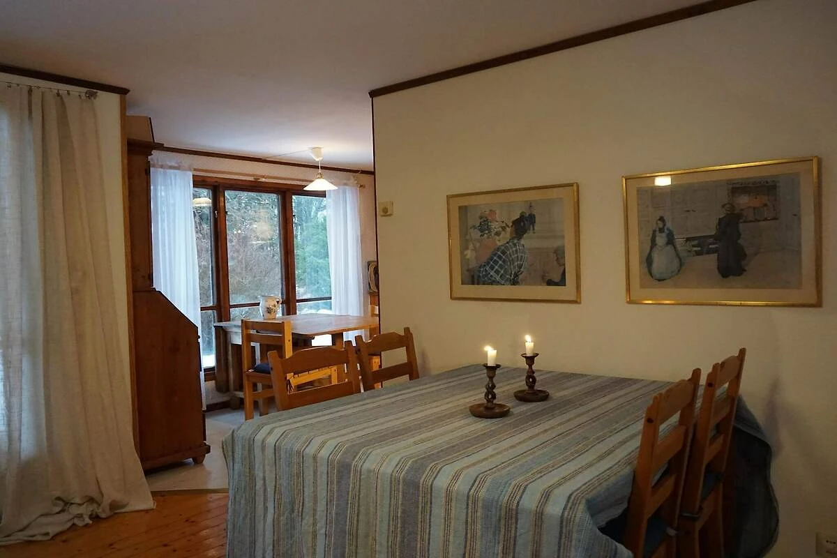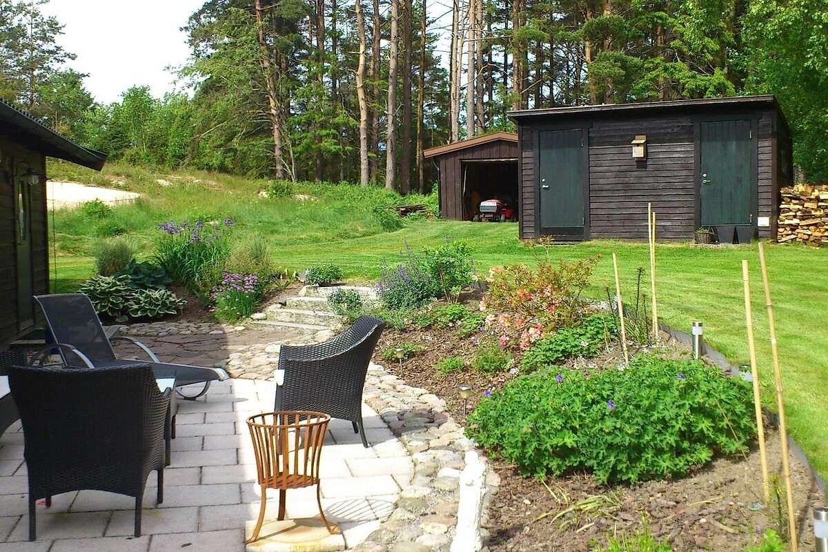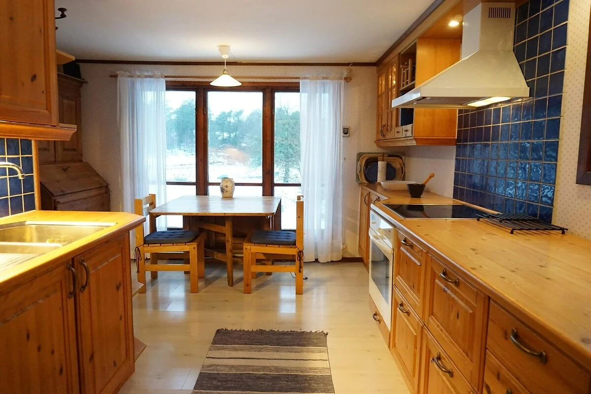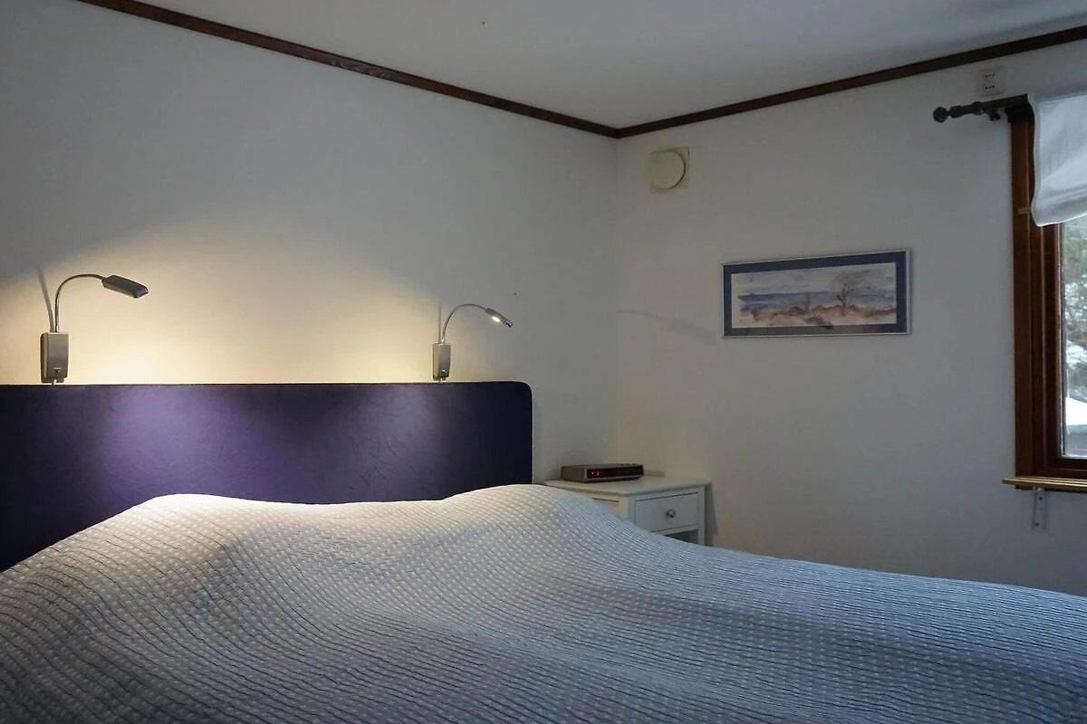 , Cucina separata(mobile cucina(elettrico), caffettiera, forno, frigo con congelatore, seggiolone, acqua dal pozzo), Soggiorno/camera da letto(TV(canali TV svedesi), radio, chromecast), Camera da letto(letto matrimoniale), Camera da letto(2x letto a castello), Camera da letto(2x letto a castello), Bagno(lavabo, doccia, WC), lavatrice, balcone, riscaldamento(elettrico), giardino, mobili da giardino, parcheggio, termopompa aria-aria