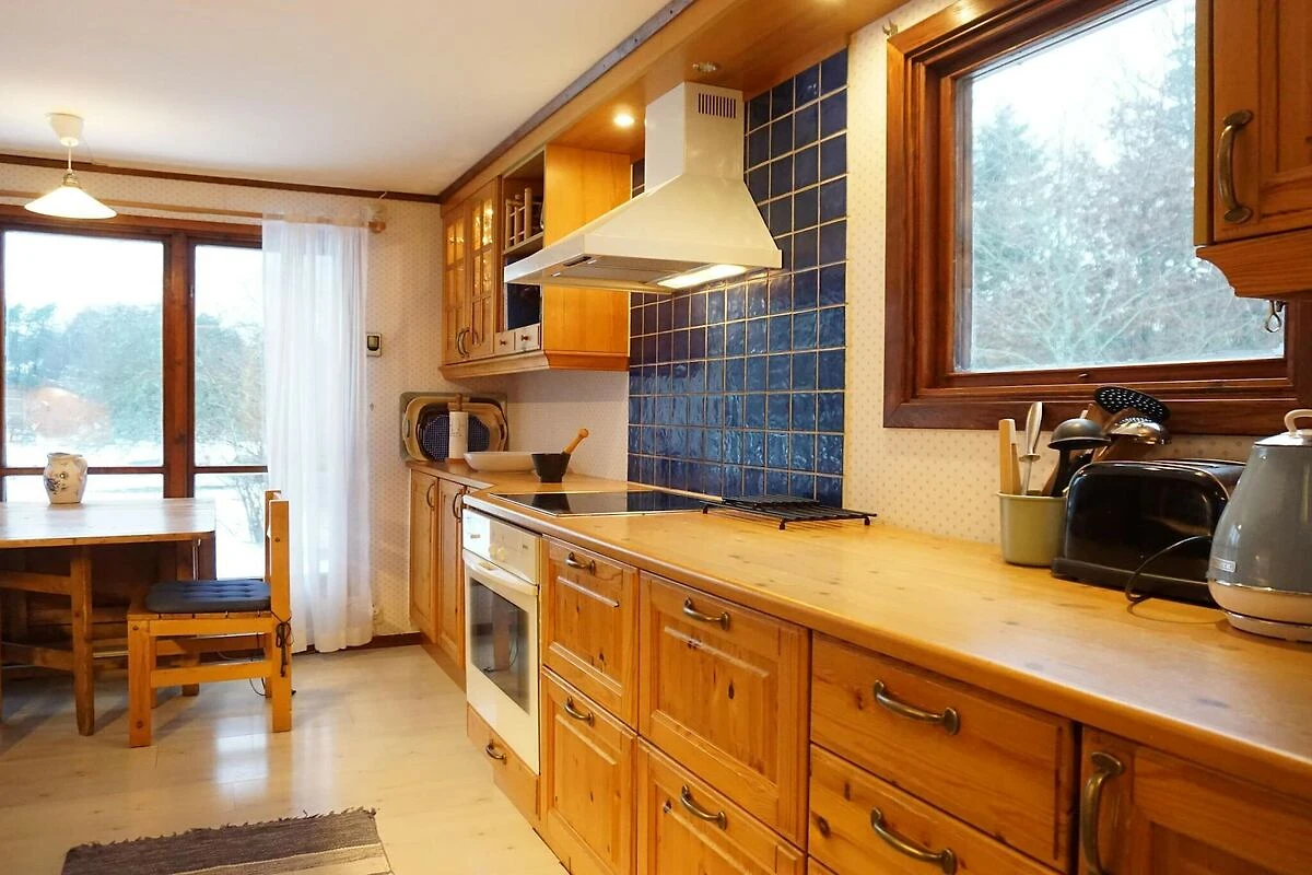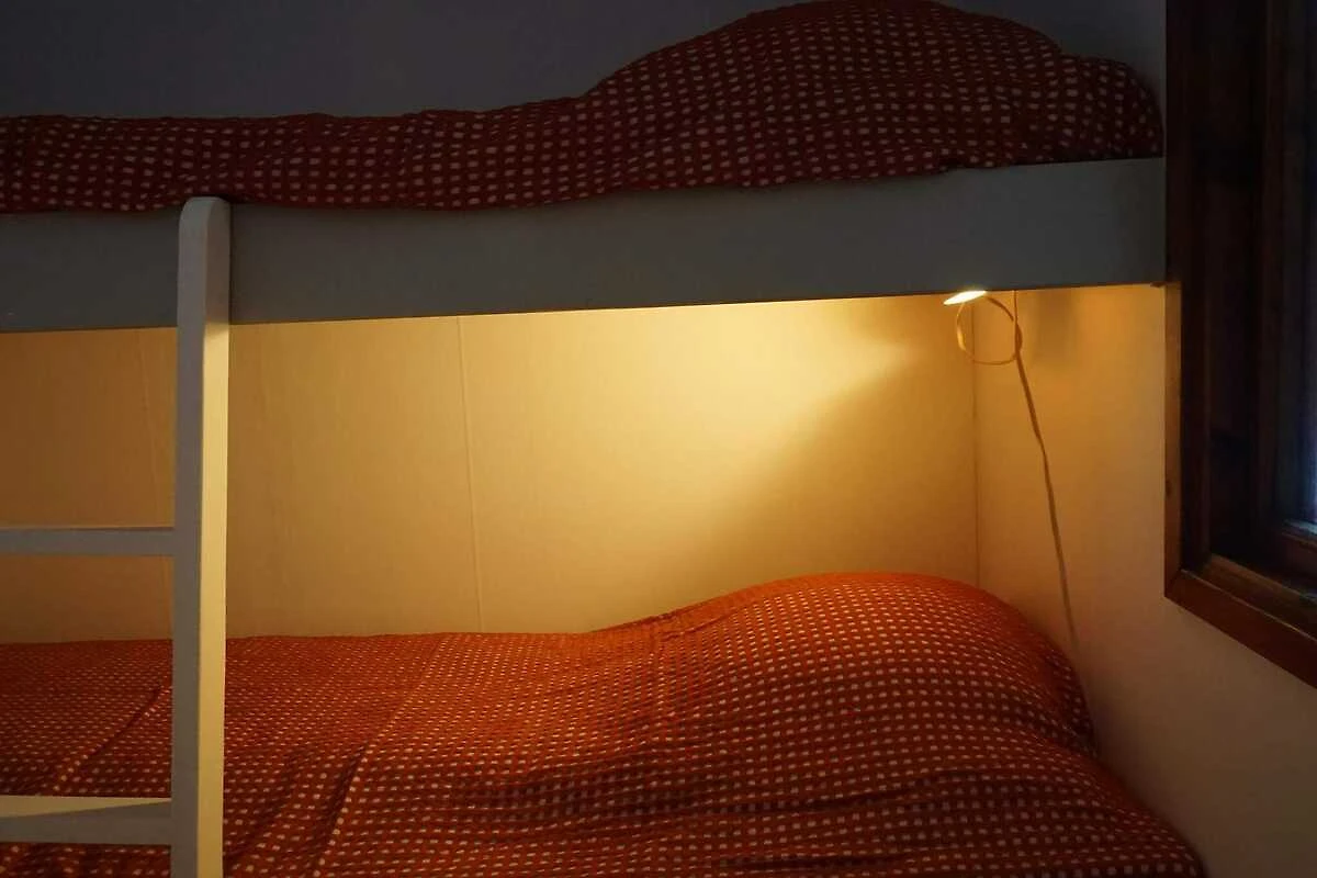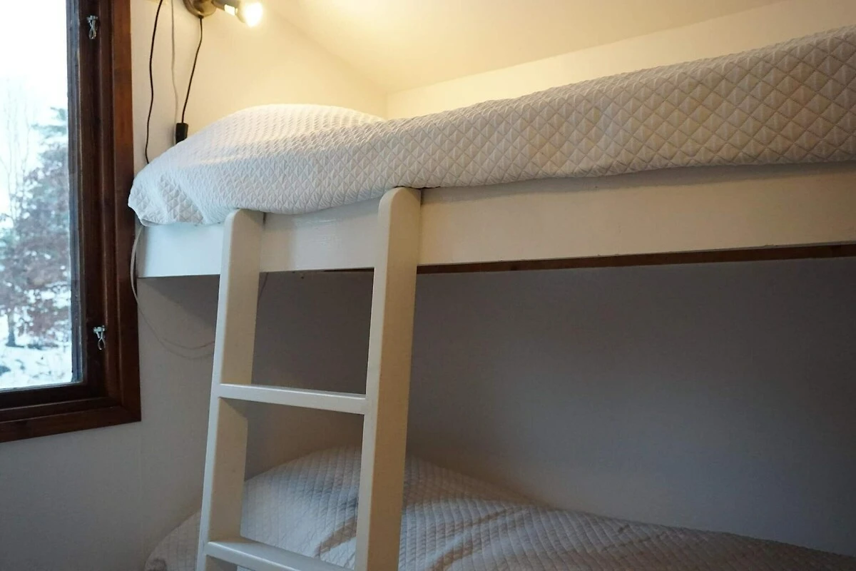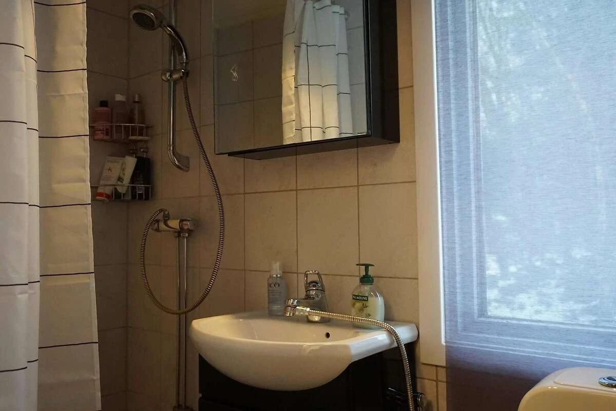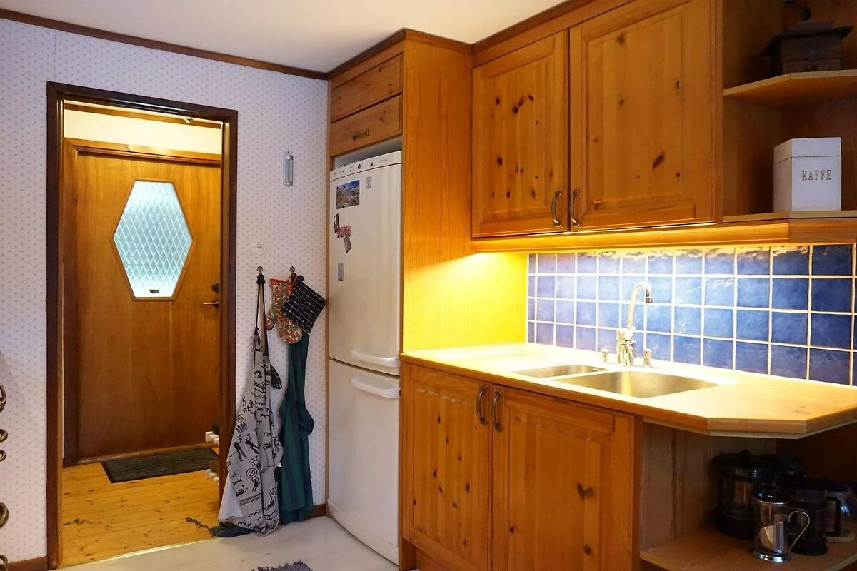, Cucina separata(mobile cucina(elettrico), caffettiera, forno, frigo con congelatore, seggiolone, acqua dal pozzo), Soggiorno/camera da letto(TV(canali TV svedesi), radio, chromecast), Camera da letto(letto matrimoniale), Camera da letto(2x letto a castello), Camera da letto(2x letto a castello), Bagno(lavabo, doccia, WC), lavatrice, balcone, riscaldamento(elettrico), giardino, mobili da giardino, parcheggio, termopompa aria-aria