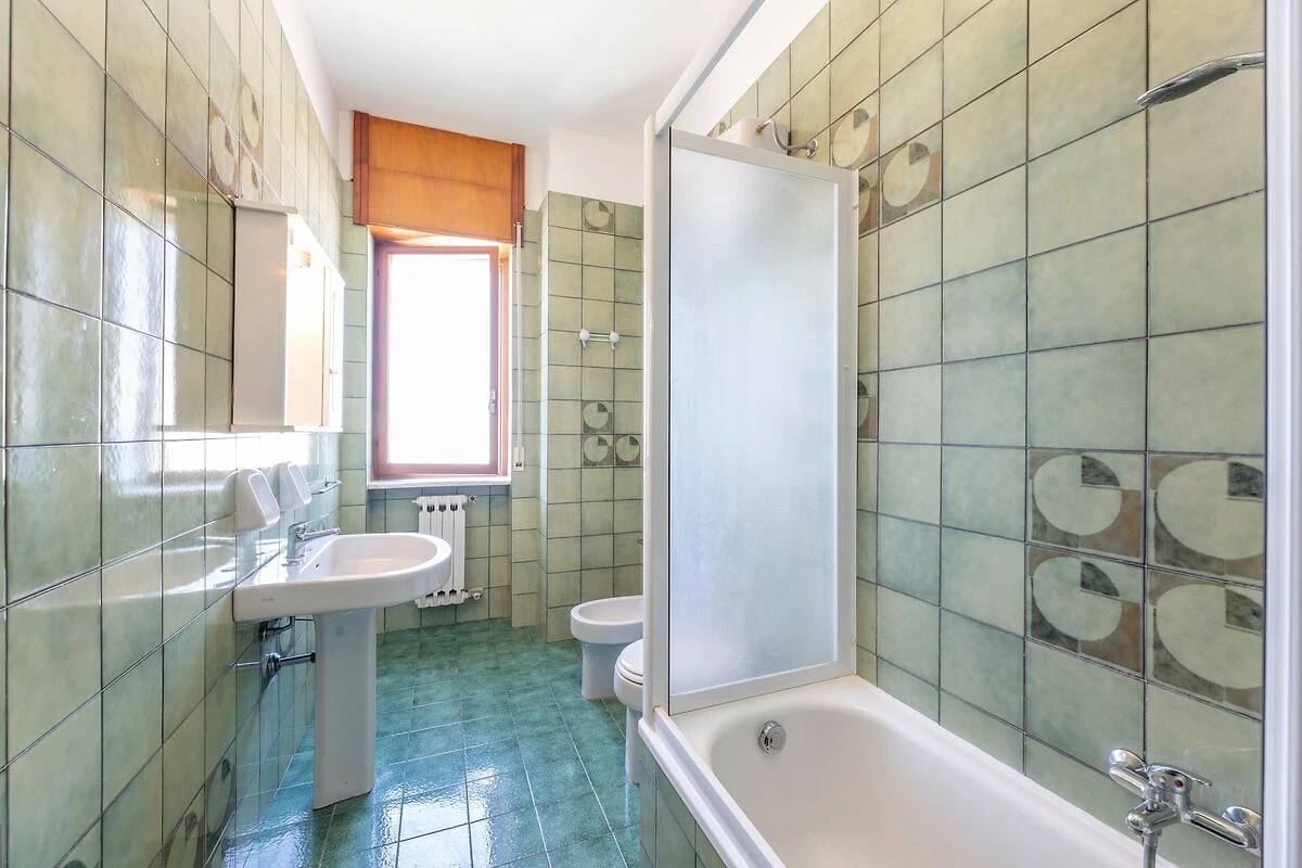 Al 5° piano: (Soggiorno(divano letto singolo, TV, tavolo da pranzo, salottino), Cucina abitabile(tavolo da pranzo, piano cottura, forno, frigo con congelatore, lavandino), Camera da letto(letto matrimoniale), Camera da letto(letto singolo, letto matrimoniale), Bagno(doccia, lavandino, WC, bidet), Bagno(vasca con doccia, lavandino, WC, bidet), lavatrice, aria condizionata, terrazza)