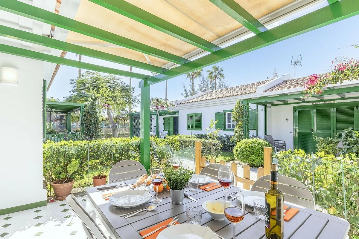 Questo bungalow con una camera da letto, splendidamente ristrutturato, offre un rifugio sofisticato e tranquillo nel cuore di Campo Internacional. Progettata con un tocco contemporaneo, la casa è un rifugio perfetto per coppie o viaggiatori singoli che apprezzano sia lo stile che il comfort. Il luminoso soggiorno, dotato di aria condizionata e Smart TV, si fonde armoniosamente con una moderna cucina a pianta aperta, dove troverete tutto, dalla macchina per caffè espresso alla lavastoviglie. La camera da letto matrimoniale è un rifugio tranquillo, completo di cabina armadio e climatizzazione per garantire un sonno perfetto dopo una giornata al sole.