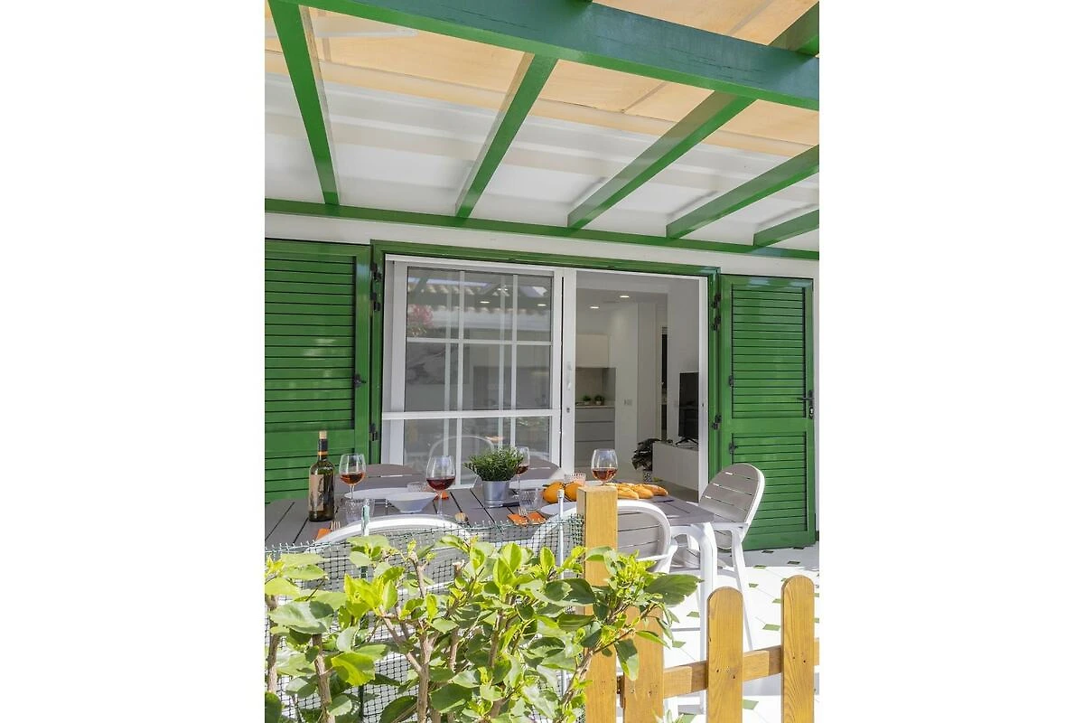 Soggiorno(divano letto doppio, TV(smart TV), aria condizionata), Angolo cottura(piano cottura, bollitore, tostapane, caffettiera(espresso), forno, forno a microonde, lavastoviglie, frigorifero, congelatore, , ), Camera da letto(letto matrimoniale, aria condizionata), Bagno(doccia, lavandino, WC, asciugacapelli), Accesso internet, lettino con sponde, lavatrice, balcone o terrazza, patio, aria condizionata, giardino(in comune con altri ospiti), mobili da giardino, piscina(in comune con altri ospiti), seggiolone, asse da stiro, ferro da stiro