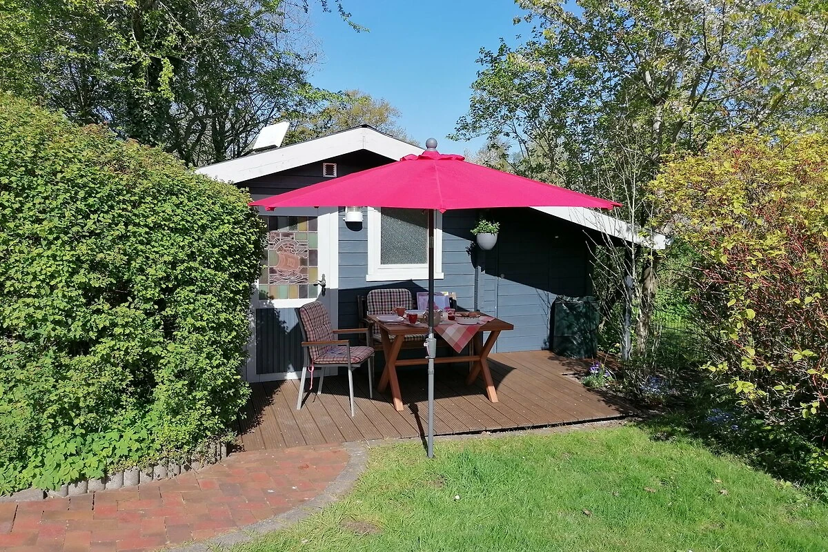 Un'altra terrazza, arredata con mobili in legno e ombrellone, si trova presso la casetta da giardino. Un posto meraviglioso per fare colazione al sole del mattino.