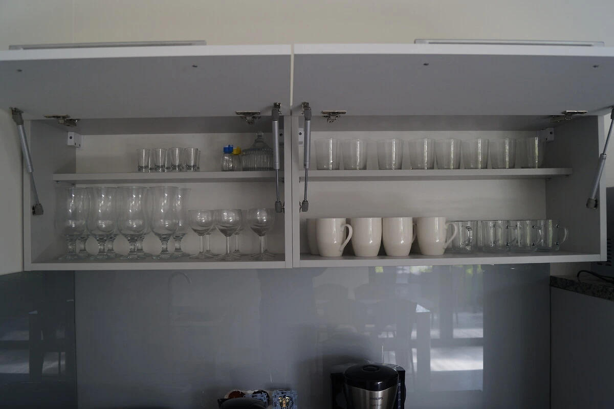 e un mobile RTV. La cucina è aperta, dispone di un frigorifero con congelatore, piano cottura a induzione (4 fuochi), bollitore elettrico, cappa aspirante, macchina da caffè, tostapane, microonde, lavastoviglie, forno. La cucina è completamente attrezzata (piatti, pentole, bicchieri, calici da vino, posate).