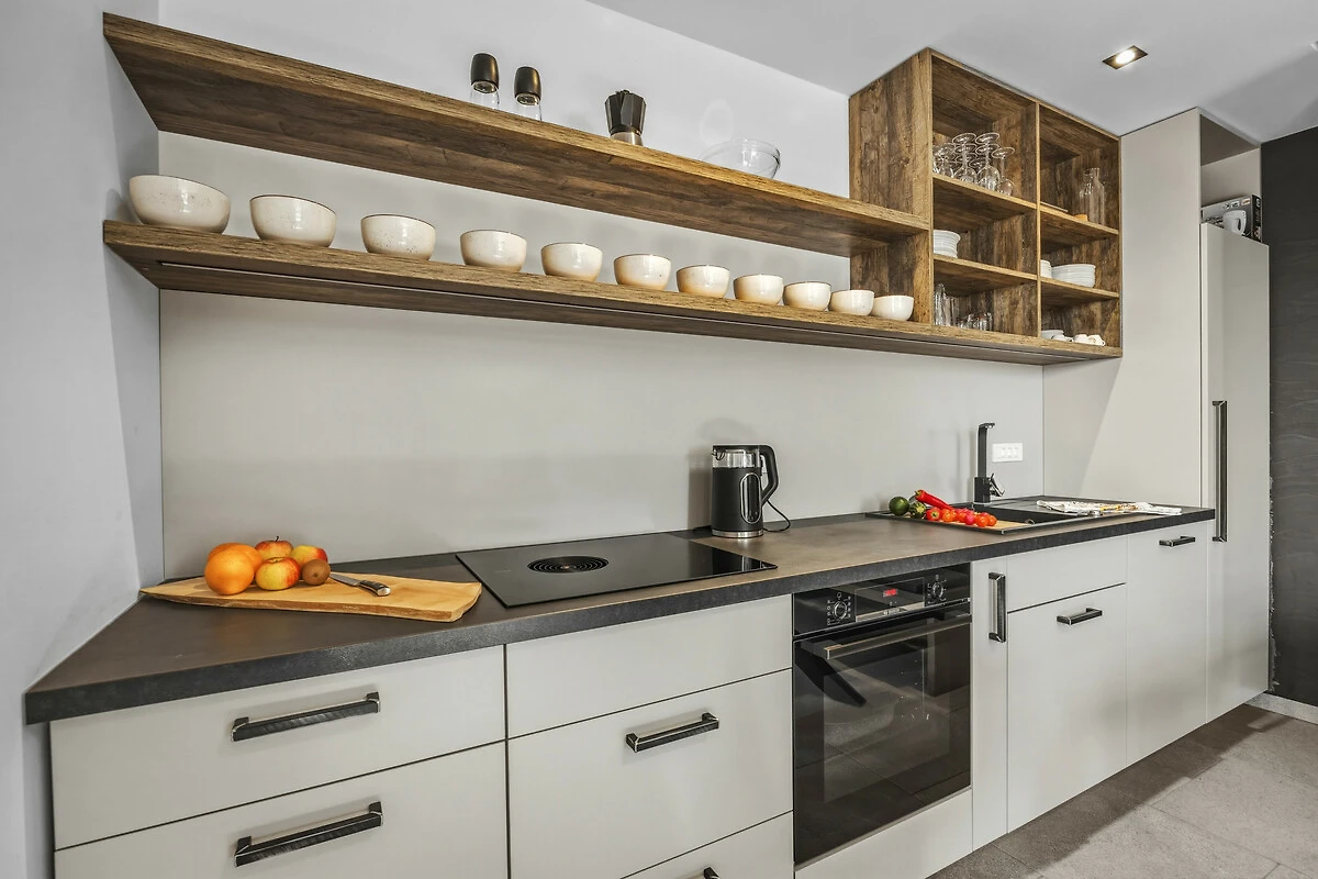 La cucina americana, a induzione, è attrezzata con frigorifero, microonde, forno, congelatore, lavastoviglie, stoviglie/posate, utensili da cucina, caffettiera, bollitore, fornello, utensili da cucina, piatti e ciotole.