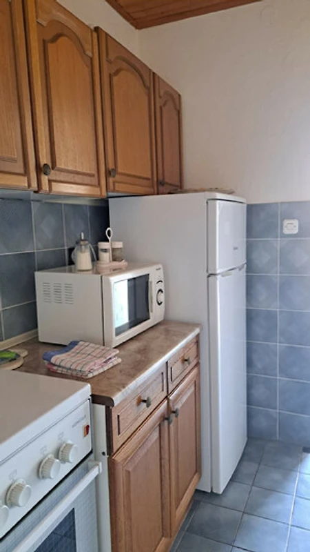 La cucina indipendente, elettrica, è attrezzata con frigorifero, microonde, forno, congelatore, stoviglie/posate, utensili da cucina, fornello, utensili da cucina, piatti e ciotole.