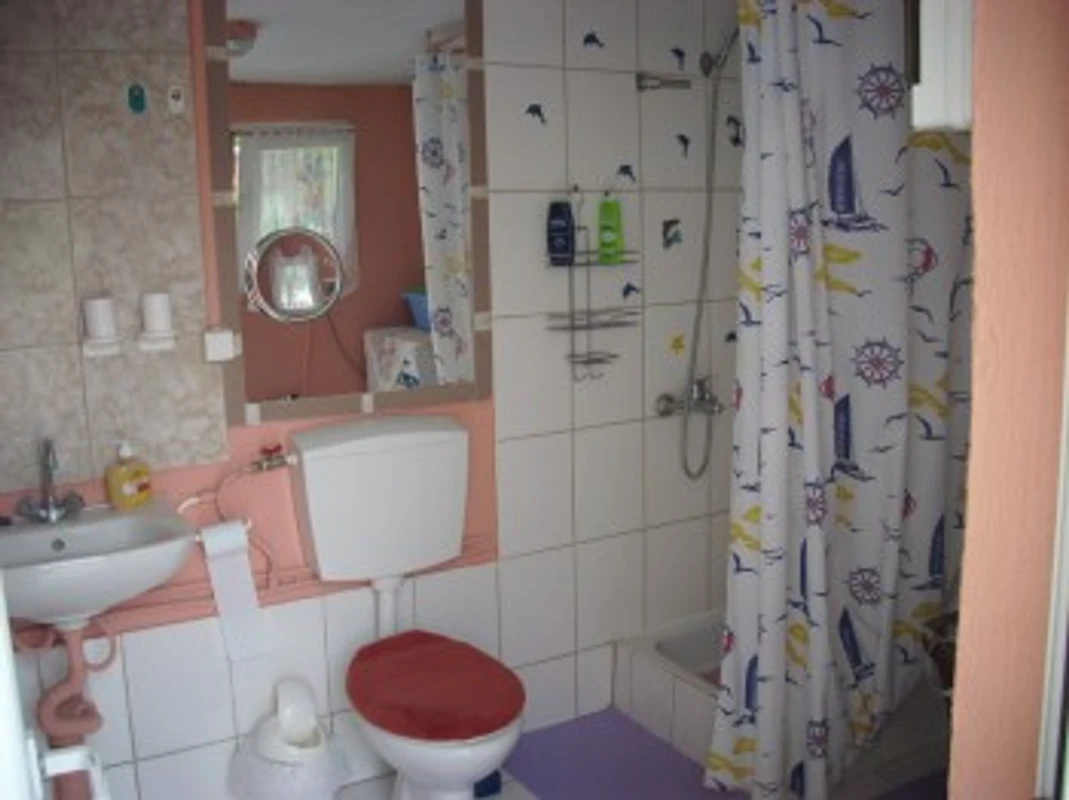 Il bagno è dotato di servizi igienici, doccia e acqua calda proveniente da uno scaldabagno.
