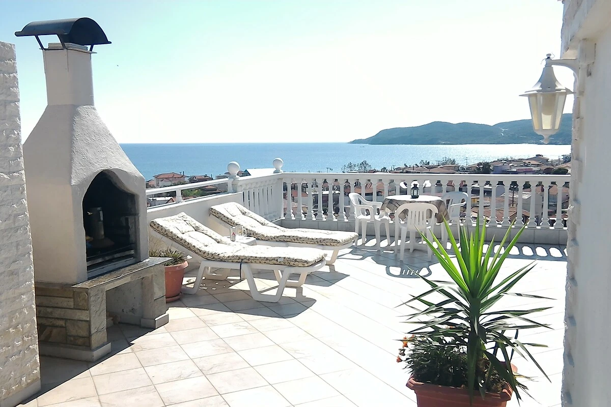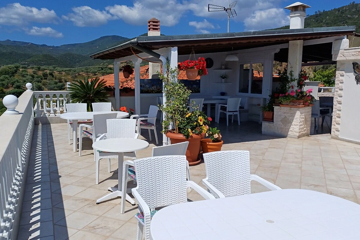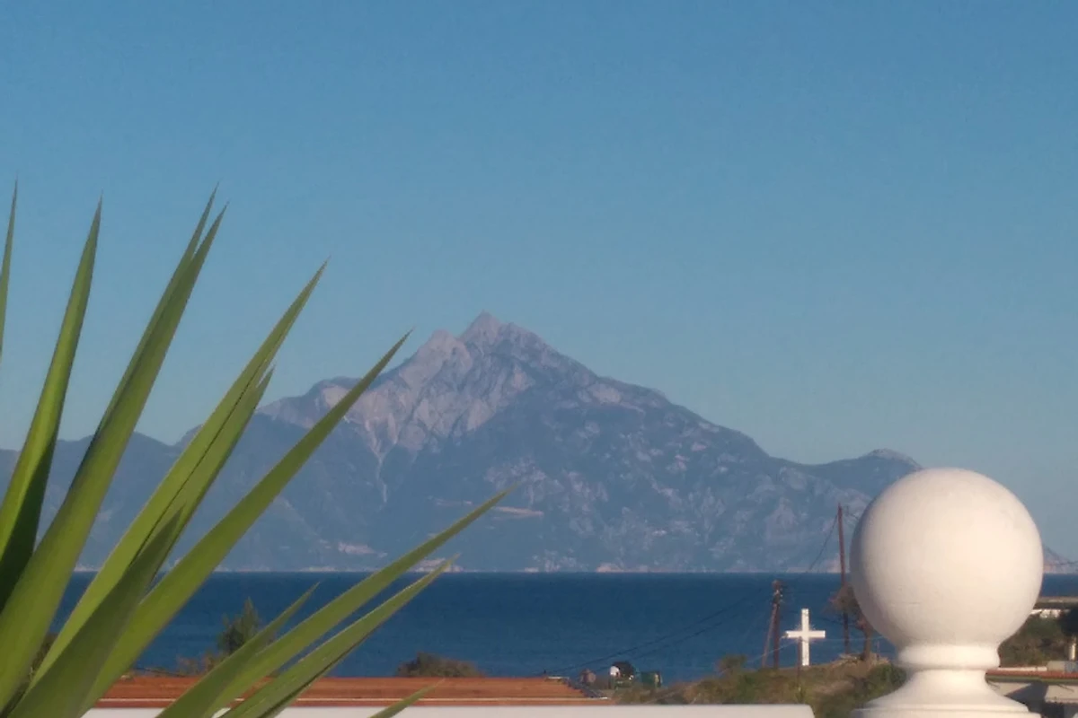 L'ampia terrazza sul tetto con lettini, barbecue e attrezzature per la colazione offre un'affascinante vista panoramica sulle montagne circostanti (Monte Athos), sul villaggio e sulla baia di Sarti, nonché l'opportunità di socializzare con gli amici o la famiglia.