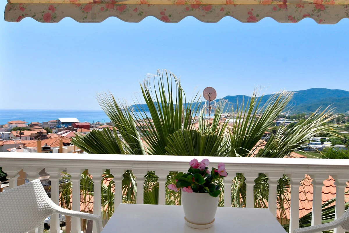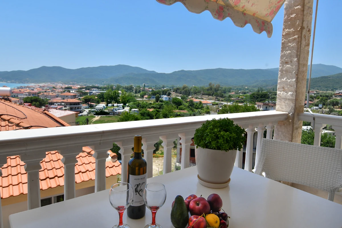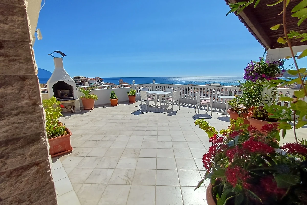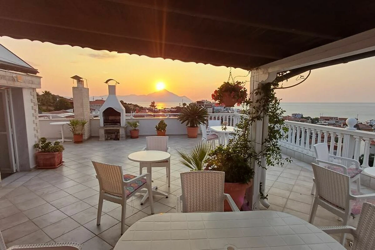 L'ampia terrazza sul tetto con lettini, barbecue e attrezzature per la colazione offre un'affascinante vista panoramica sulle montagne circostanti (Monte Athos), sul villaggio e sulla baia di Sarti, nonché l'opportunità di socializzare con gli amici o la famiglia.