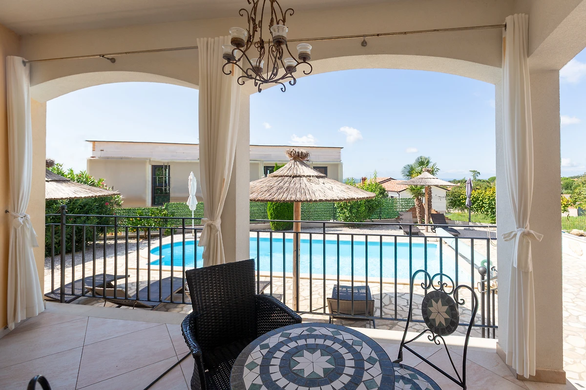 Barbecue in giardino per serate gustose e conviviali. Una grande piscina con vista sul mare e una superficie prendisole molto ampia intorno all’area piscina.