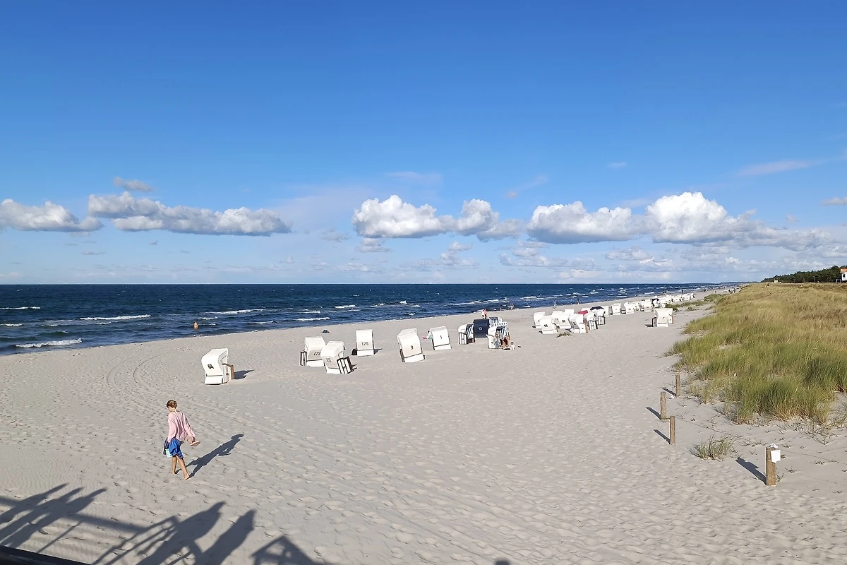 Da Prerow, attraverso la foresta primordiale di Darß (47 km² di area forestale), si può raggiungere la spiaggia occidentale in bicicletta in circa 30 minuti. Nessuna sedia a sdraio. Solo la vastità del mare, una spiaggia di sabbia bianca e fine lunga 13 km e una splendida natura selvaggia.