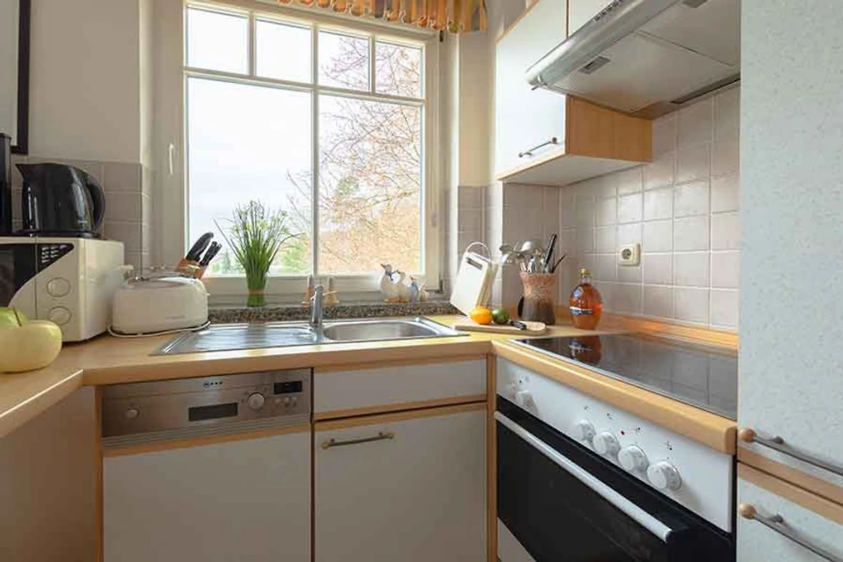 La spiaggia di sabbia lunga 2,6 km, il pontile di Sellin, la Wilhelmstraße (passeggiata) con numerosi negozi, ristoranti e caffè sono facilmente raggiungibili in pochi minuti. La spiaggia di Sellin costituisce l’estremità settentrionale di un’ampia baia balneare di sabbia fine (noleggio di sedie da spiaggia, grande scivolo d’acqua, tratti per FKK) con vista sulla costa alta boscosa di Sellin.