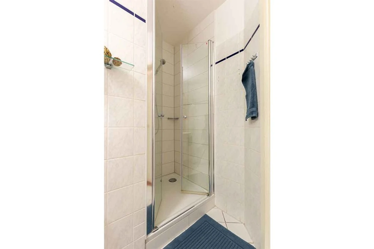 Sullo stesso livello si trovano una camera da letto con letto matrimoniale e il bagno con doccia e balcone.