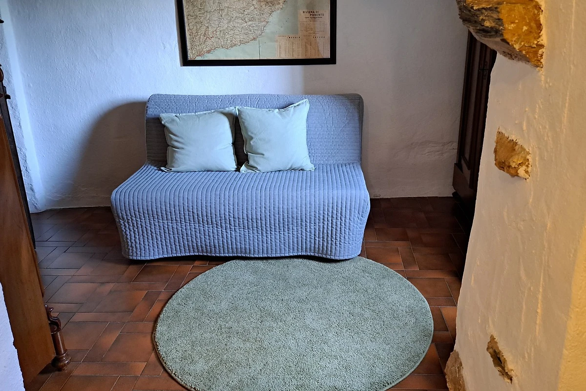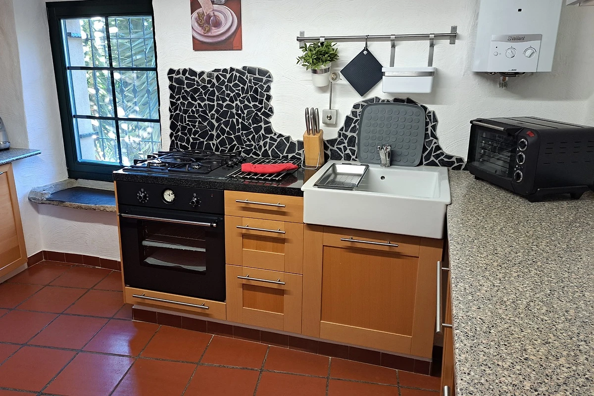 In alto, sopra la Lerronetal che si apre a lontano verso il mare, è circondato da ulivi e vigneti, questa casa colonica restaurata con sensibilità del 18 ° secolo. Si compone di tre unità, due delle quali si distinguono come case vacanza. La creazione di entrambi gli oggetti è in stile rustico con elementi rustici, ma attrezzature e tecnologie moderne, ove necessario. L'appartamento "Patio" ha una superficie di generosa 90 mq ed è adatto per una occupazione fino a sei persone. La camera da letto ha un letto matrimoniale (1,80x2,00) e un divano letto, camera dei bambini con due letti singoli (1,00x2,00) attrezzata. I letti sono materassi buoni tedeschi. Nella accogliente soggiorno con TV / SAT si possono trovare anche anche un divano-letto estraibile (1,40x1,94). Il comodo bagno ha una grande doccia, lavabo, WC, asciugacapelli e aree di stoccaggio spaziose. In cucina con armadi a muro e moderni elettrodomestici (lavastoviglie, forno, piano cottura, KGS, macchina per caffè espresso e macchina per il caffè) si trovano tutti i servizi necessari per la preparazione dei suoi pasti. Piatti e bicchieri sono ampiamente disponibili. Nelle giornate fredde, un camino per il calore accogliente. La sala da pranzo ha un grande tavolo da pranzo per un massimo di sei persone. Il vero punto forte è l'area circondata da spesse mura di pietra patio davanti alla porta della sala da pranzo, che invita entrambi i pasti abbondanti e serate romantiche a lume di candela. Se ti senti come sulla società, ha in comune zona barbecue giardino con barbecue e grande tavolo da pranzo su. Questo giardino con una rigogliosa vegetazione mediterranea, come fichi, oleandri, aranci e limoni è più segreta biscotti, dove si può godere una tranquilla leggere il suo libro o mantenere il suo pisolino arredato. Un piccolo orto con erbe aromatiche fornisce gli ingredienti per i loro pasti. Il pool di 5,00 metri di diametro, rende per divertimento e ristoro.